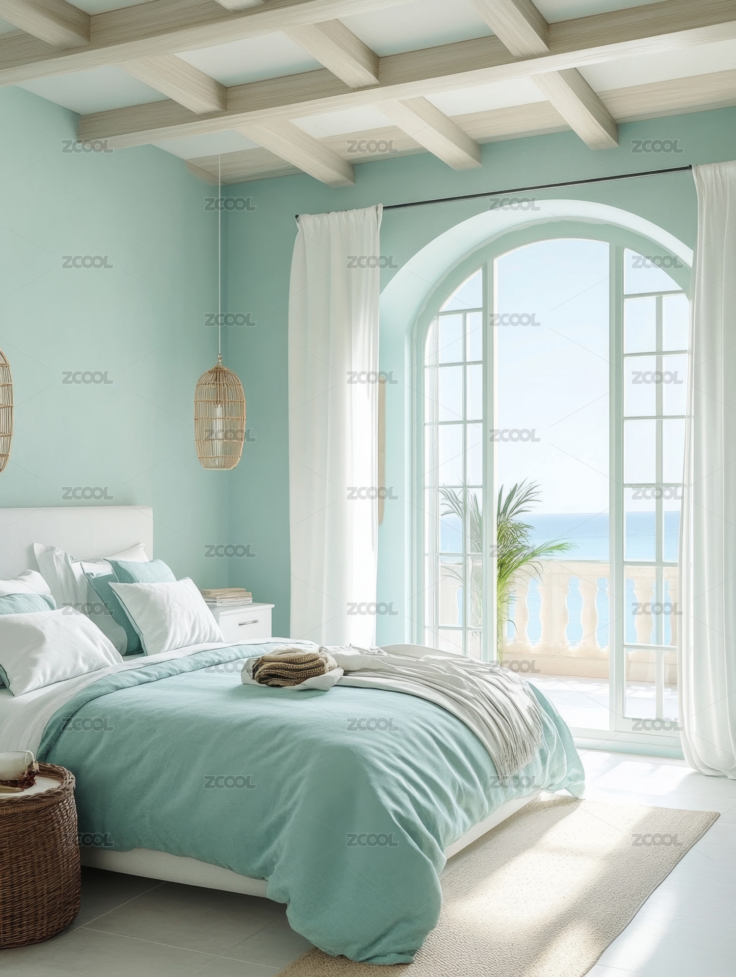 卧室,床,窗帘,自然光,景观,室内,设计,舒适,灯具,海景