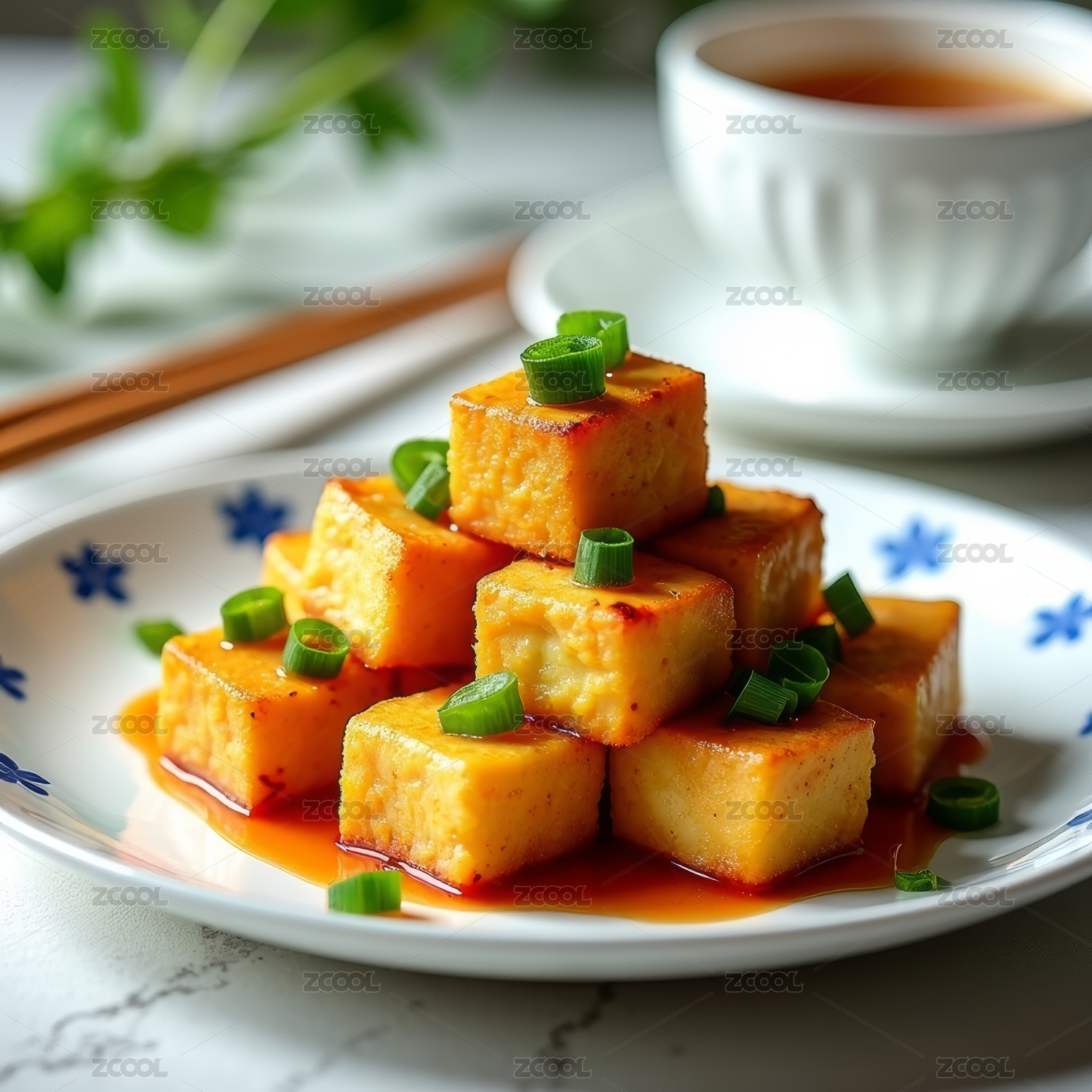 桌面上的盘子里的美味可口的小葱拌豆腐