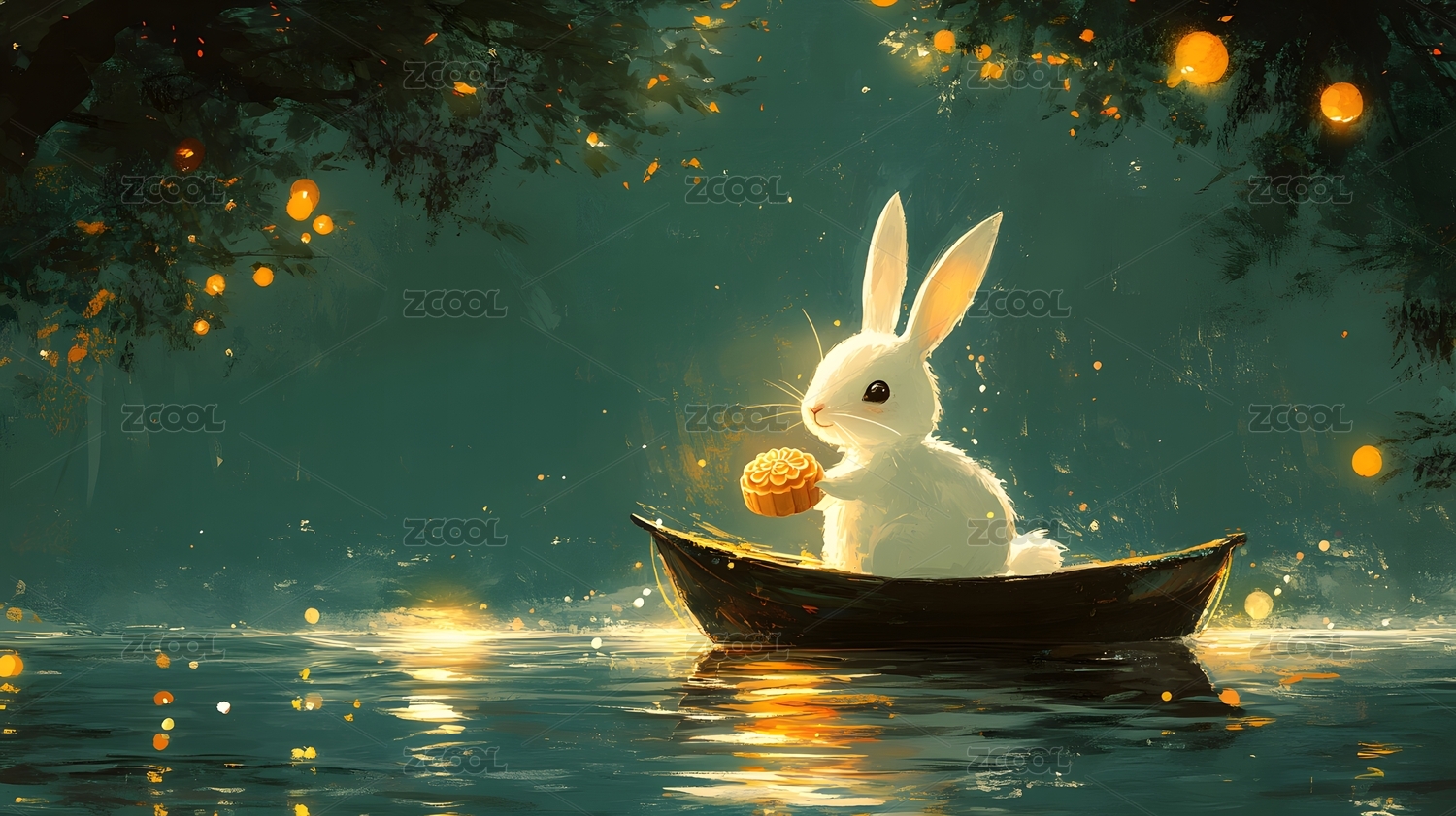 兔子在中秋节之夜坐船吃月饼
