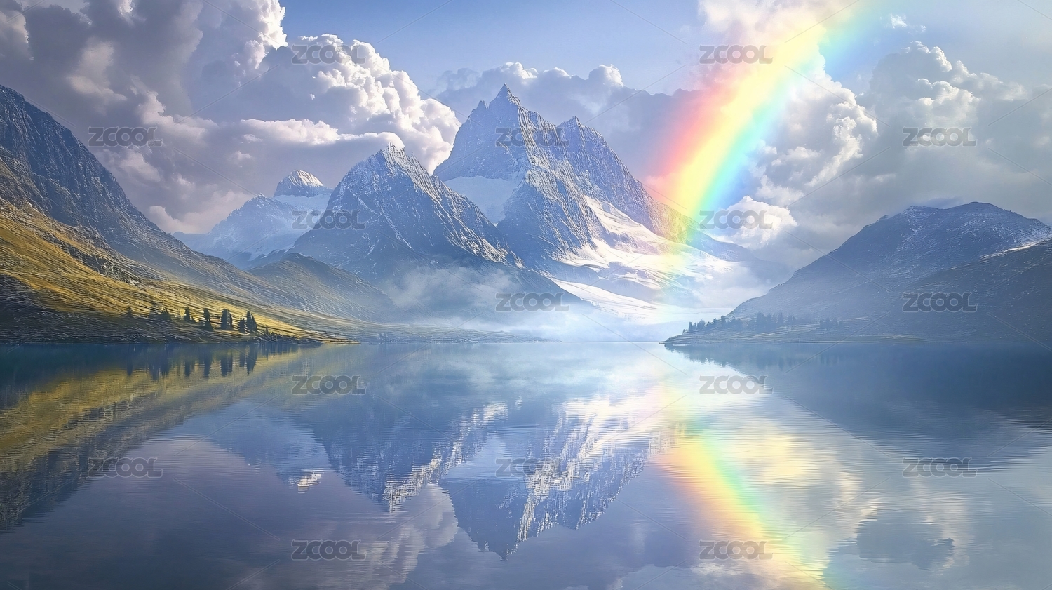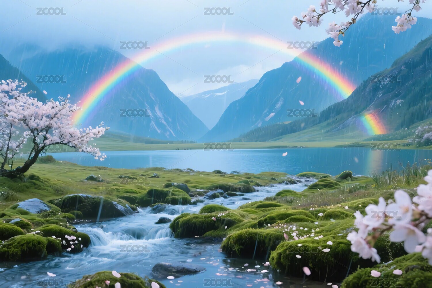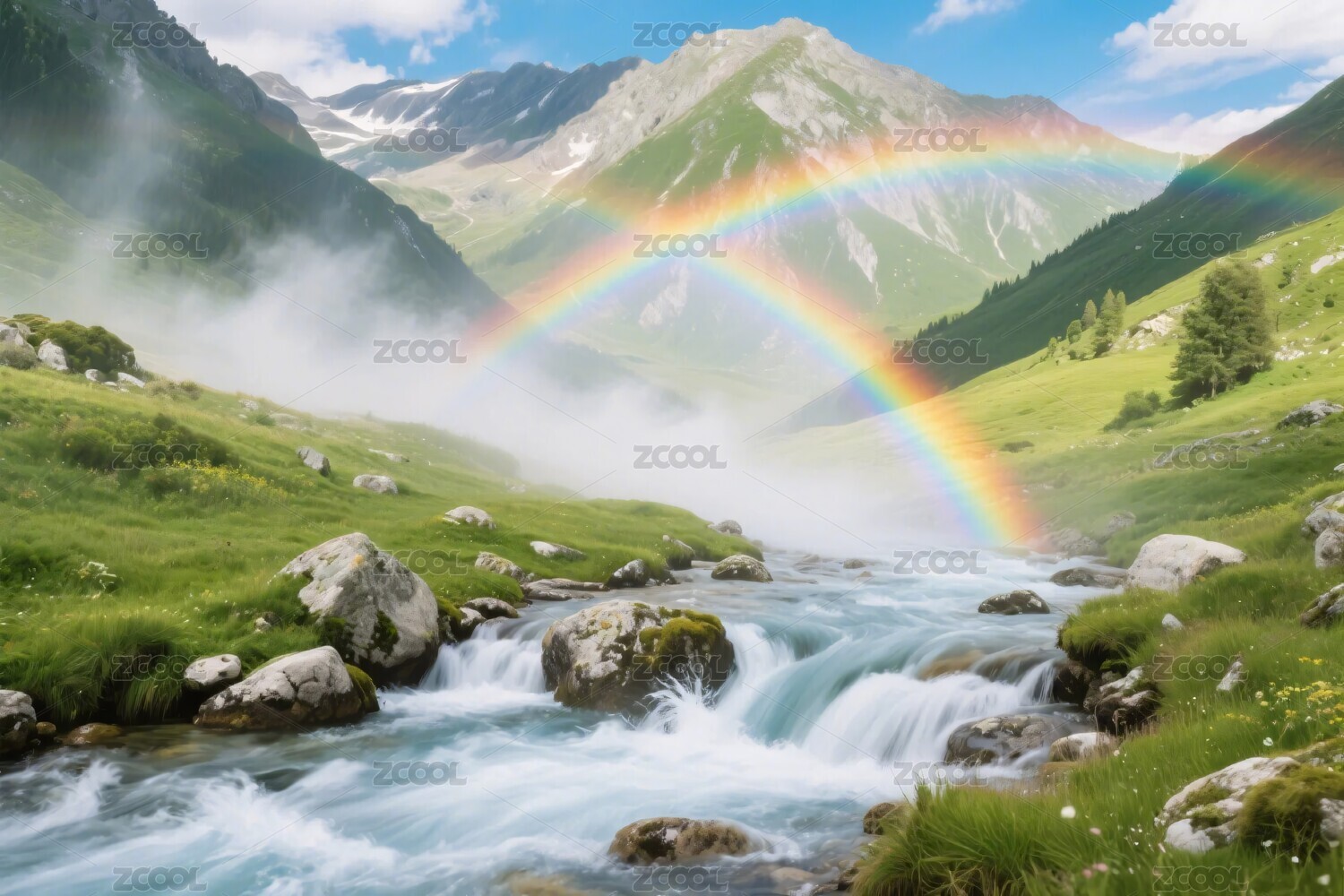 彩虹,山谷,溪流,草地,花朵,山峦,自然,风景,美好,清新