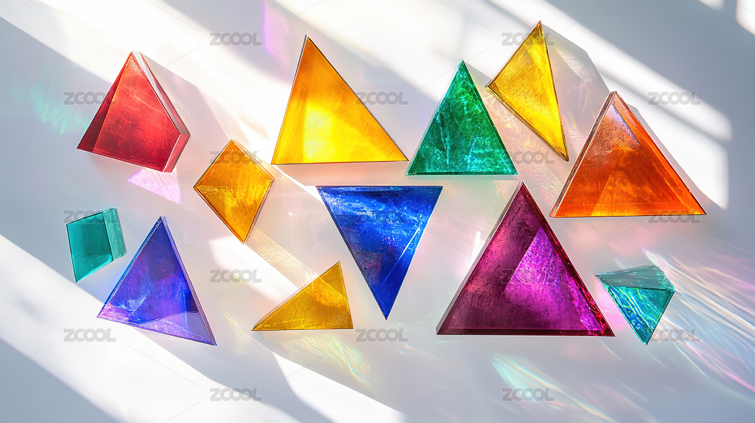 多彩透明棱柱形物件排列展示