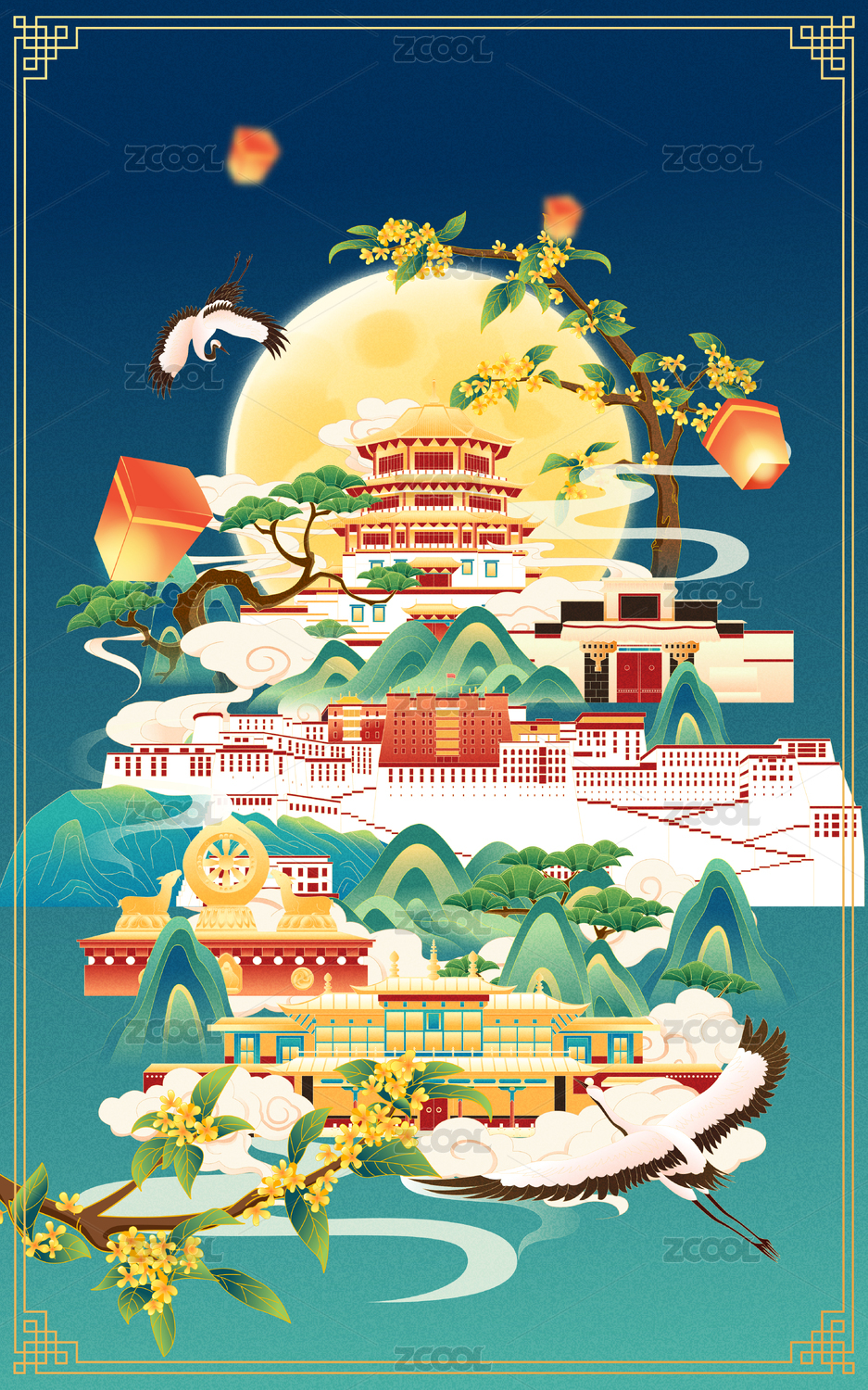 国风中秋节拉萨城市建筑矢量插画