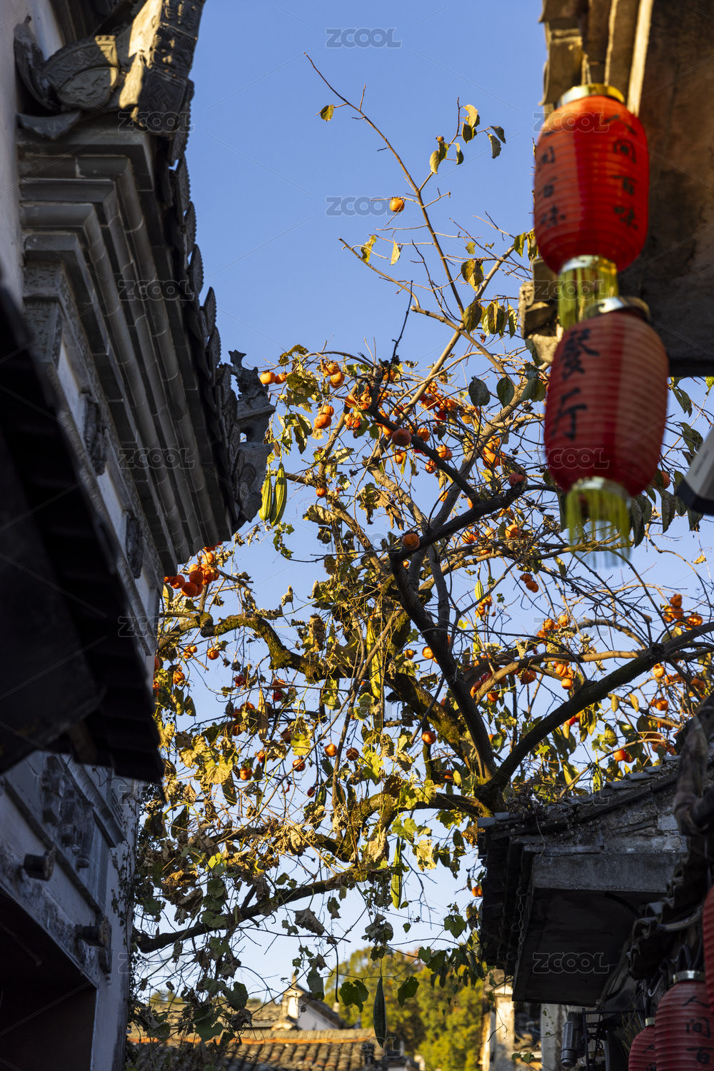 节日中中国江南老街的古建筑与树梢上的灯笼
