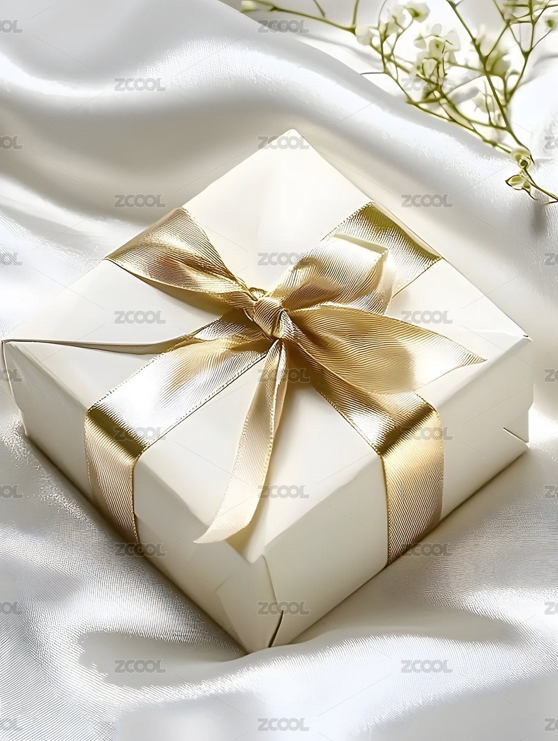 金色礼物盒与白色小花的浪漫邂逅