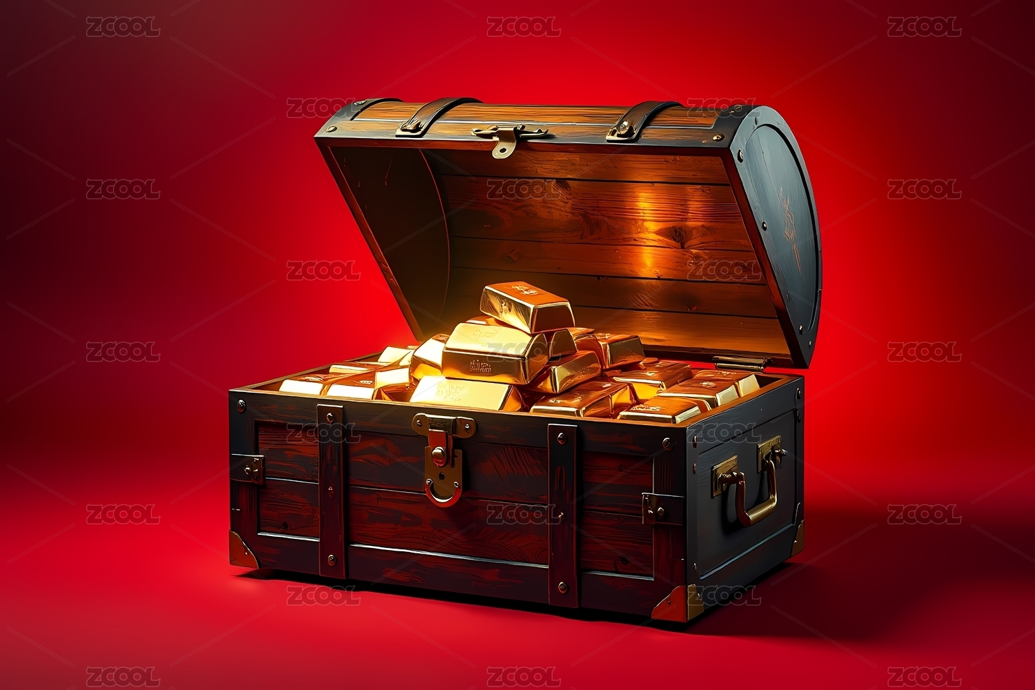 红色,背景,宝箱,木箱,把手,金条,黄金,金属扣,铆钉,打开