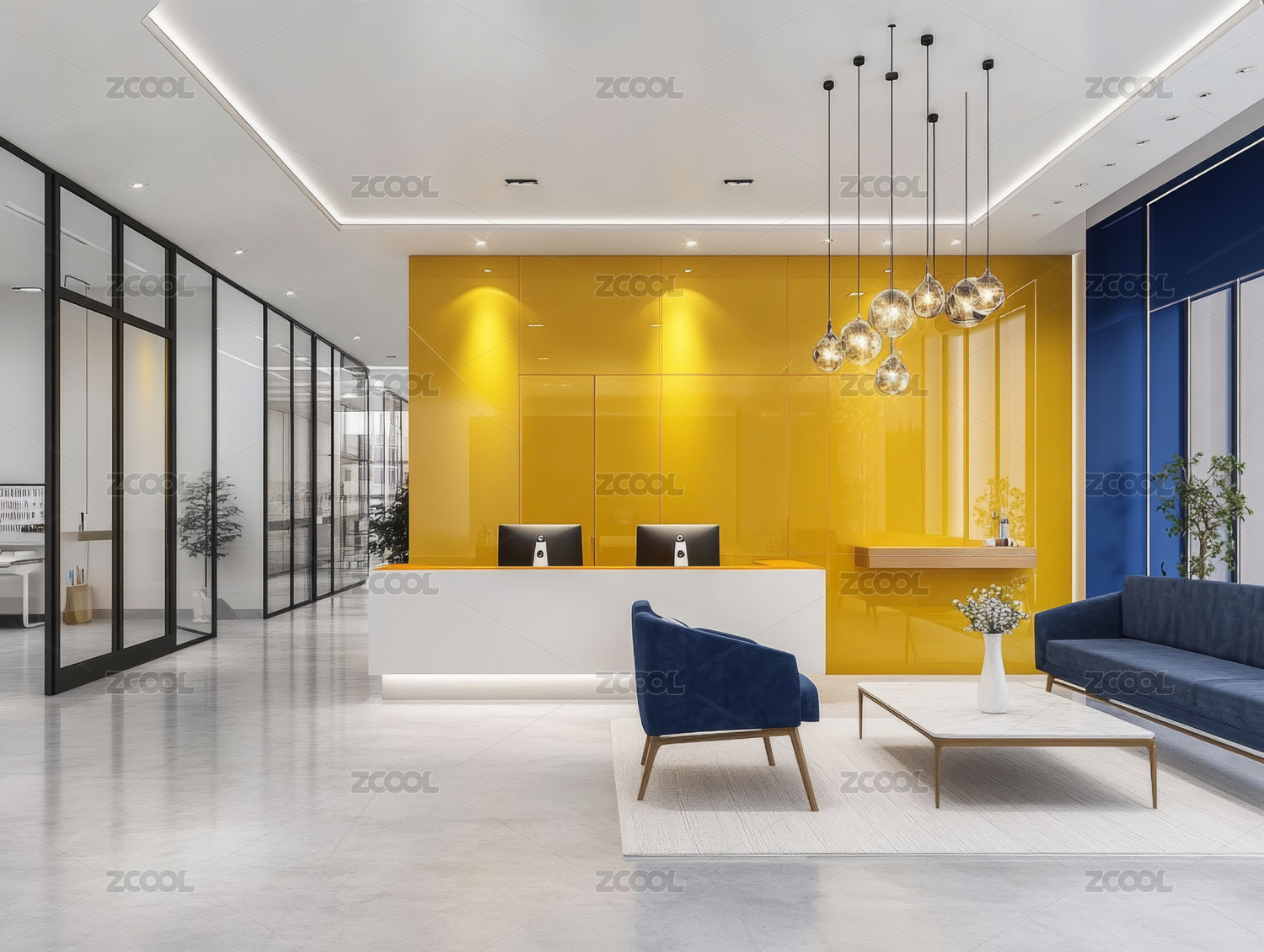 办公室,现代,室内,设计,黄色,蓝色,椅子,桌子,植物,吊灯