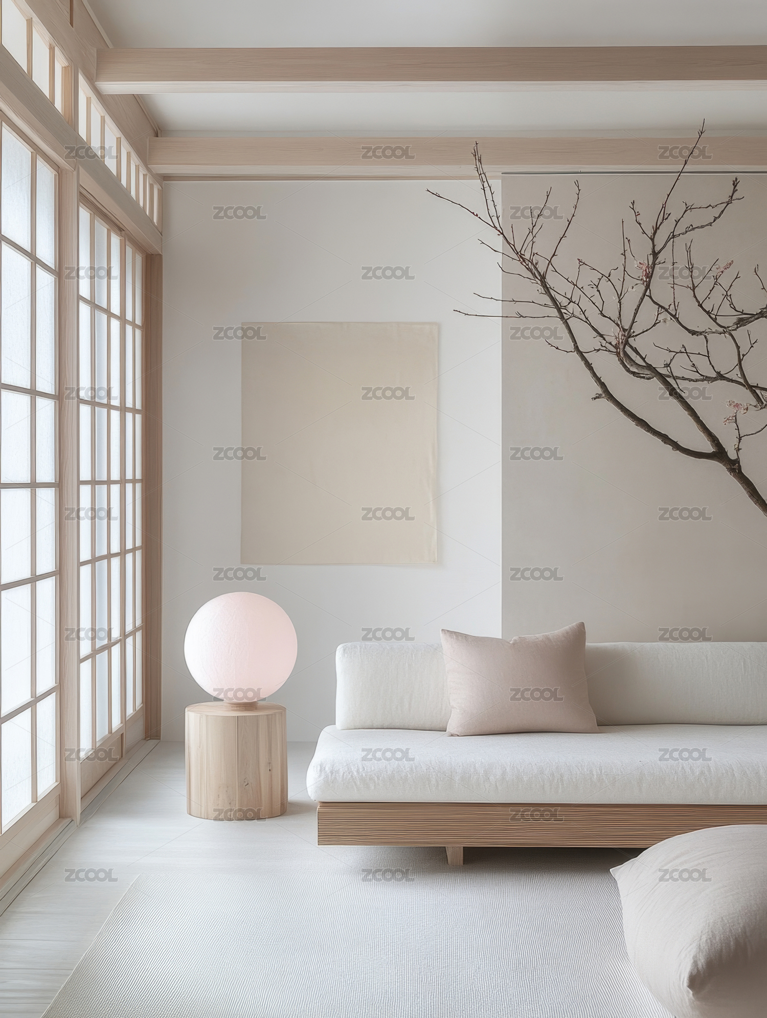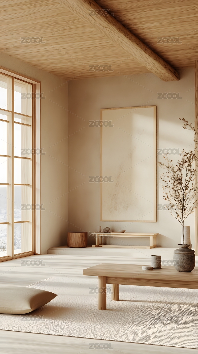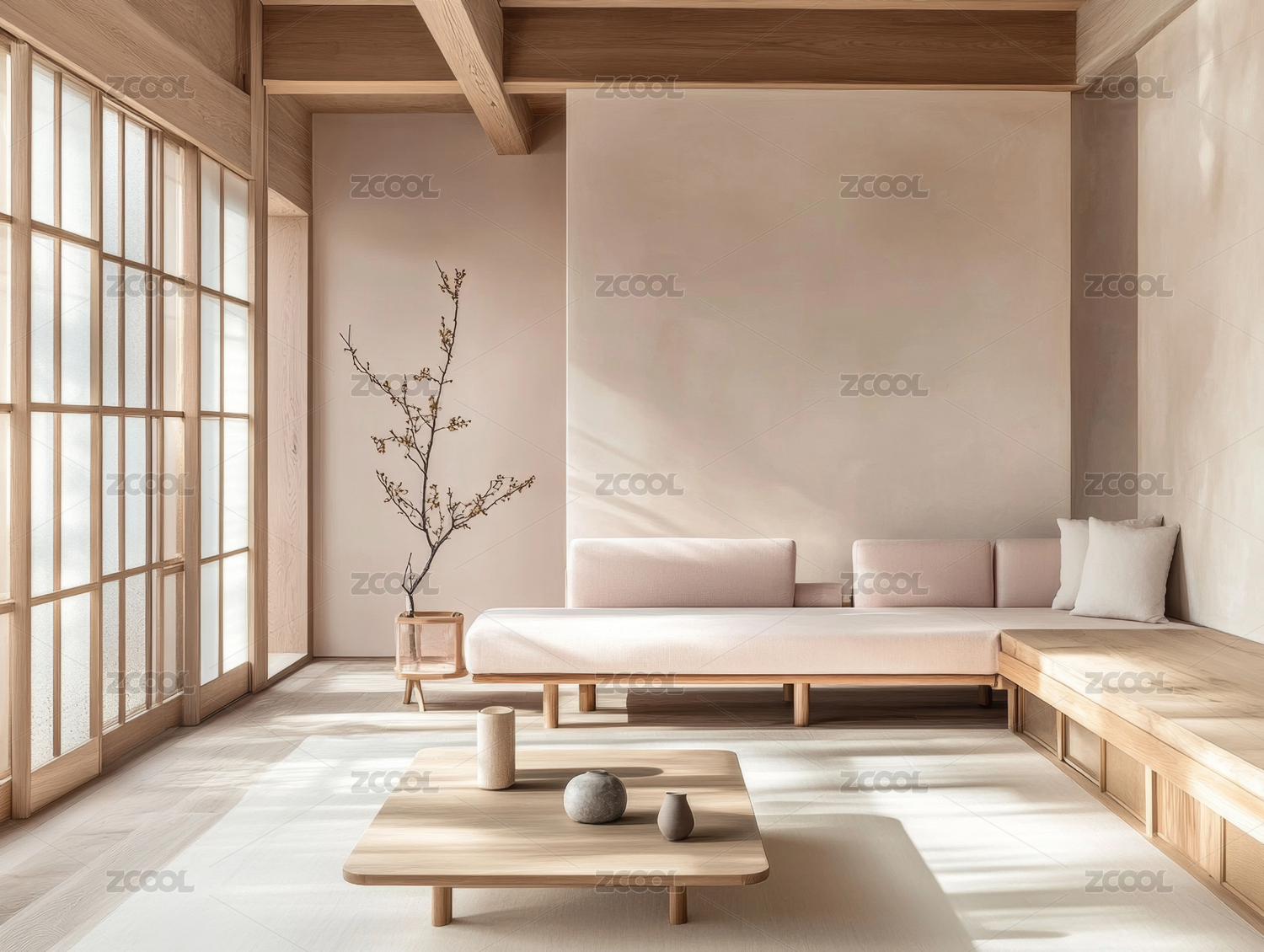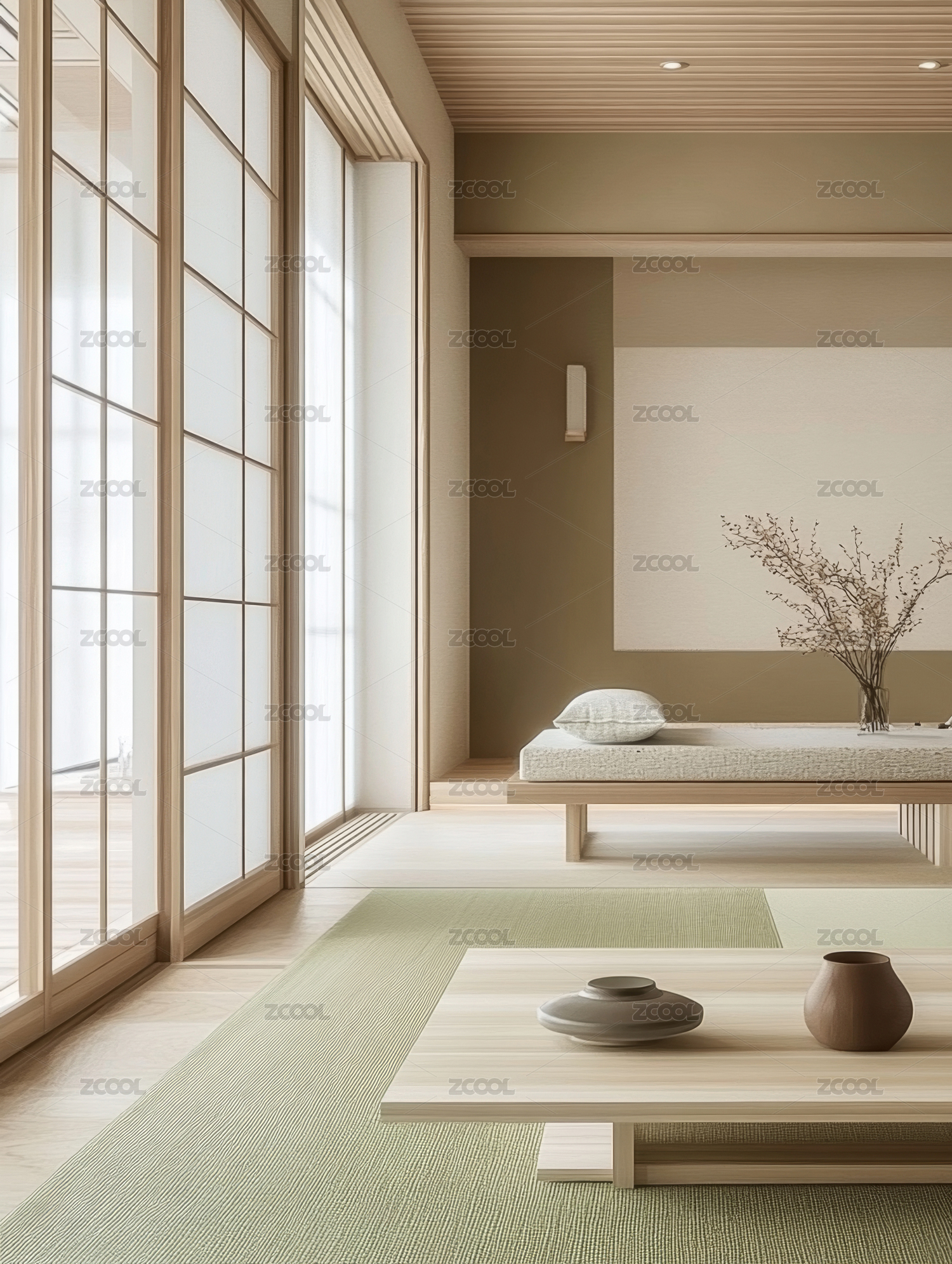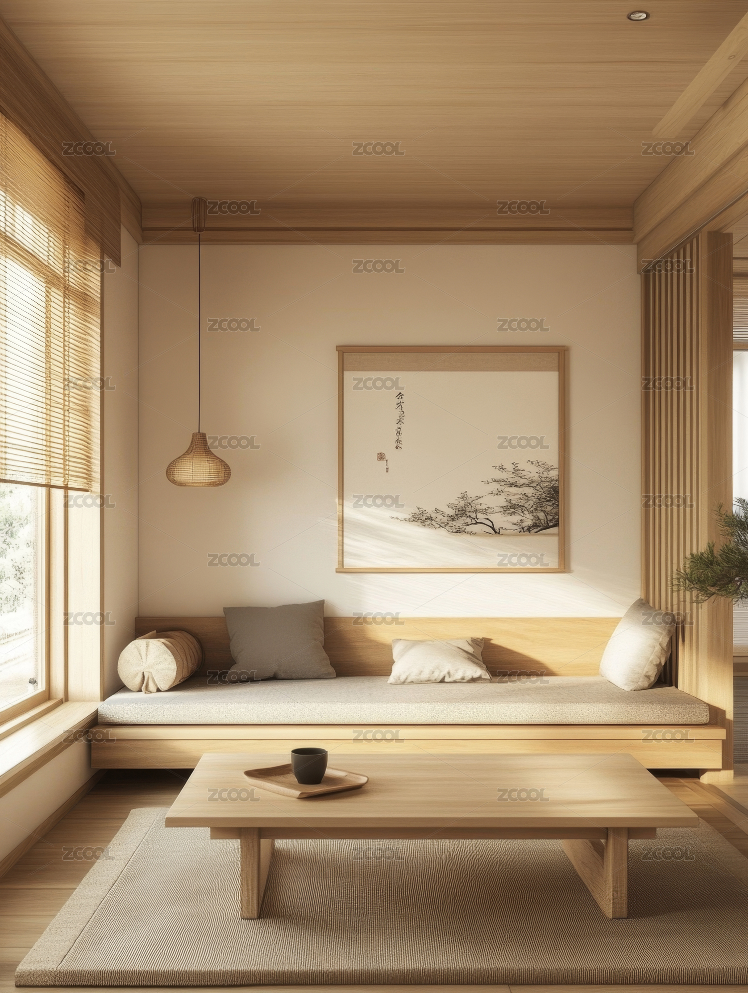 日式,简约,客厅,木质,榻榻米,茶具,植物,装饰,自然光
