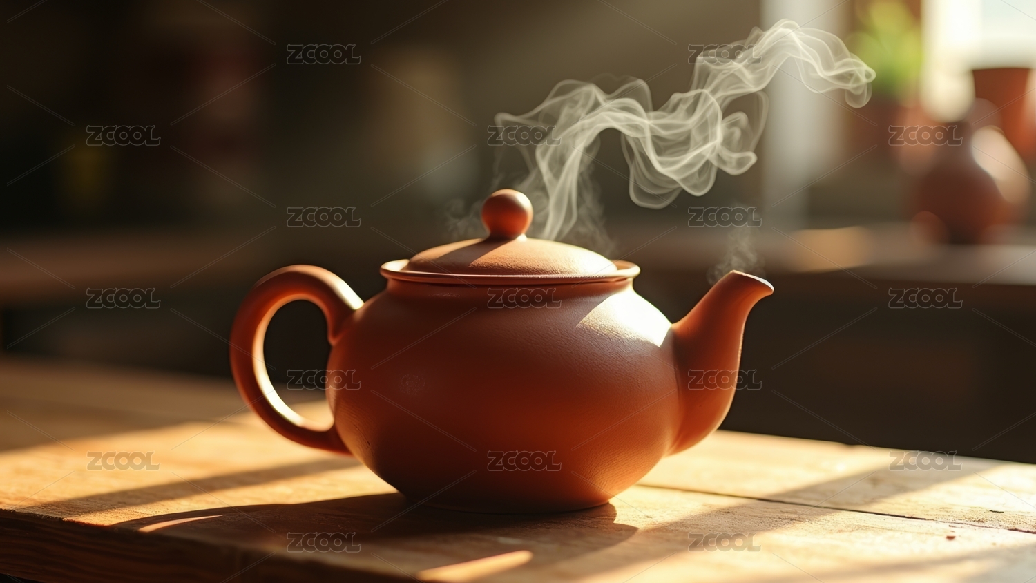阳光照射在木桌上冒着热气的茶壶上
