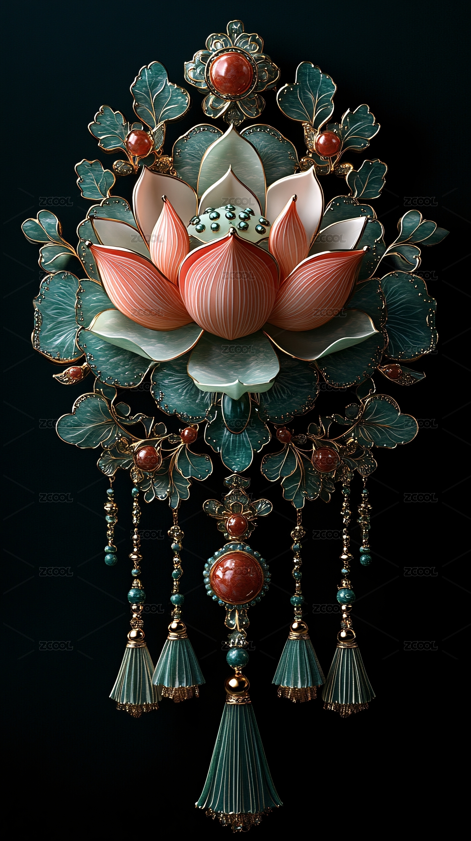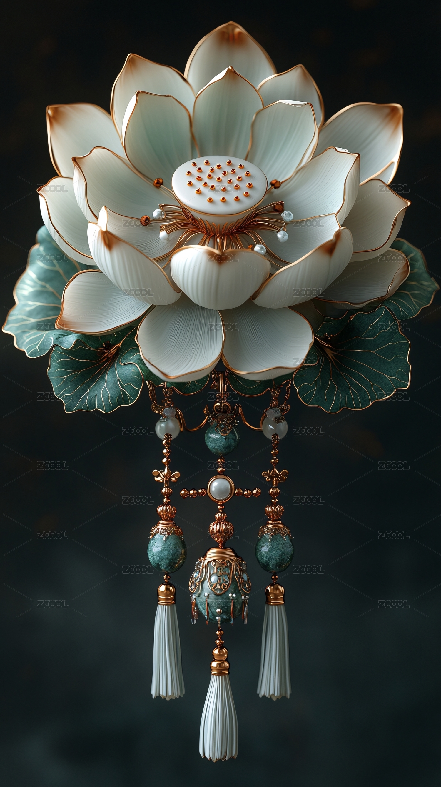 挂饰,莲花,花瓣,花蕊,叶片,金玉,宝石,绿玉,金饰,链条