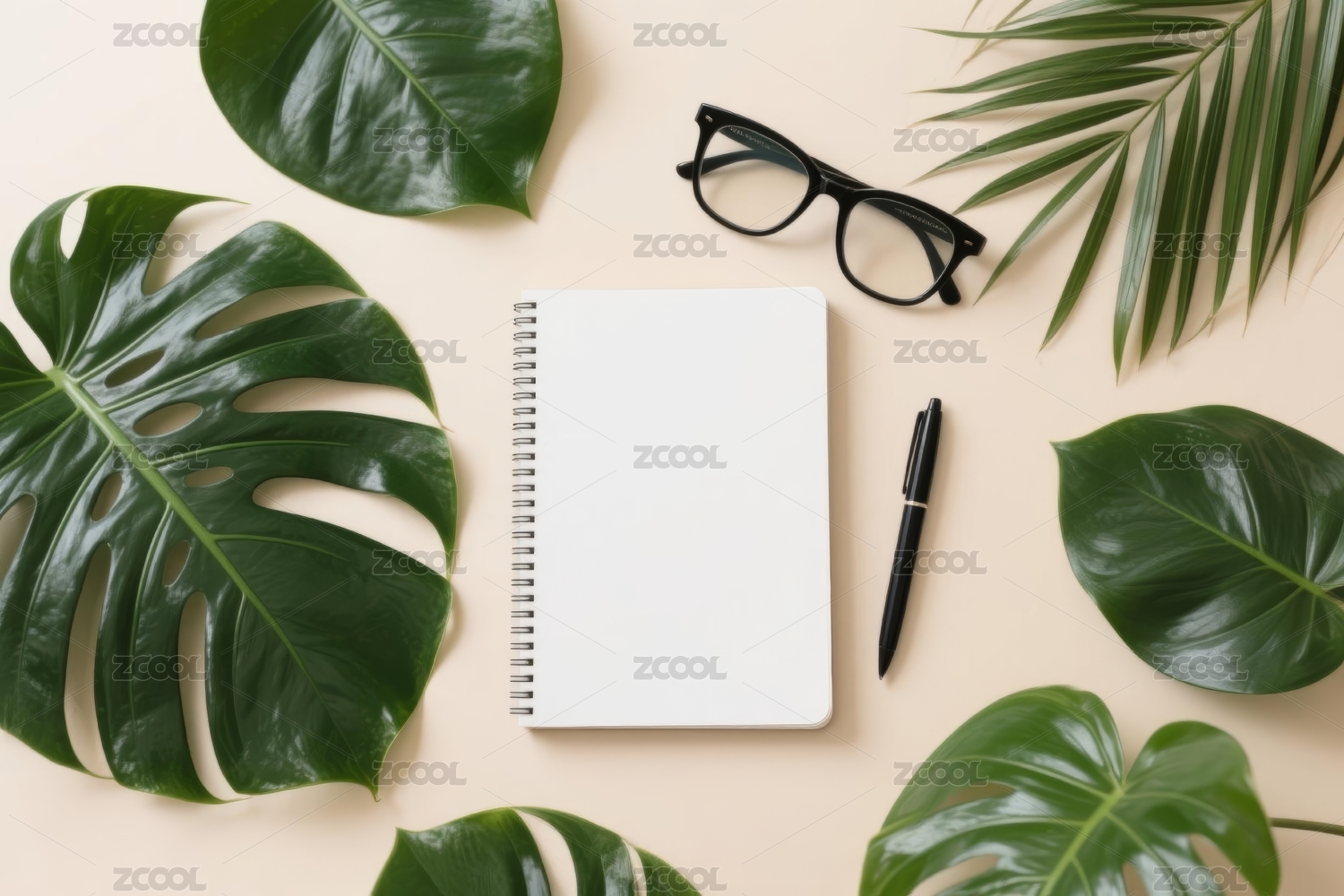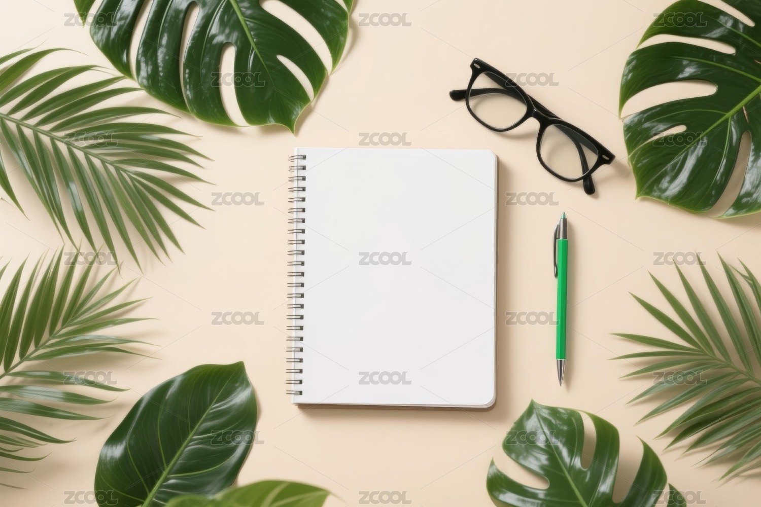粉色背景上的绿植笔记本和笔