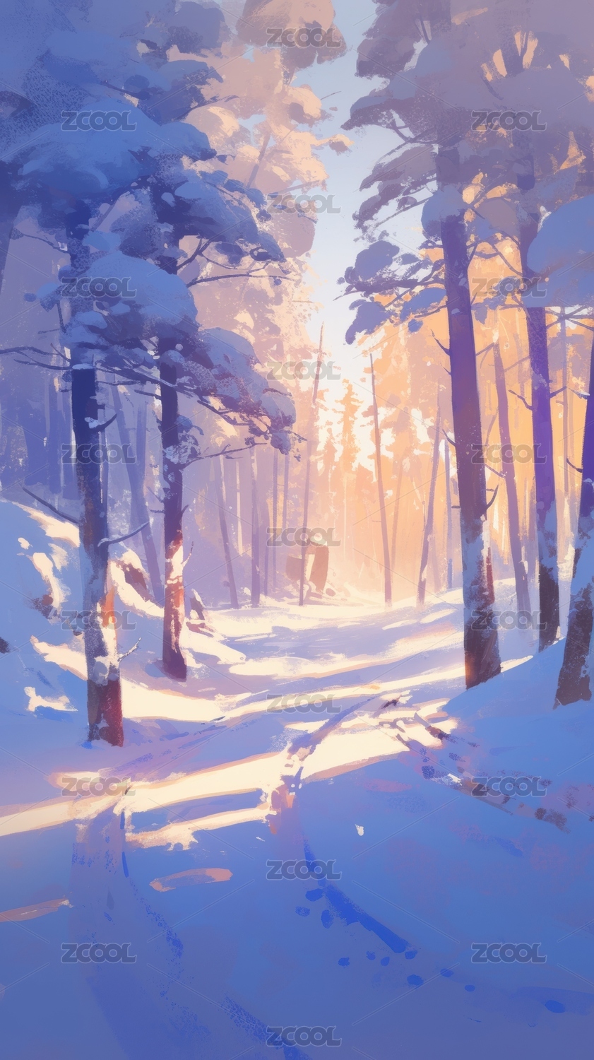 清新明亮冬天有厚厚的积雪的树林插画绘画