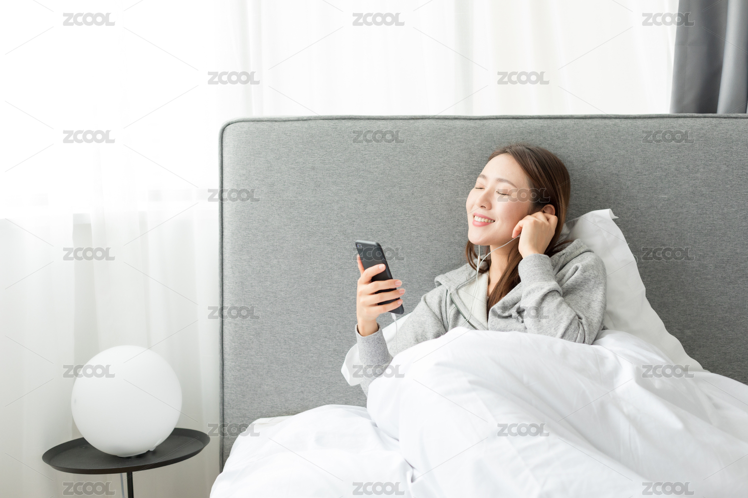一名年轻女性在床上靠着听音乐