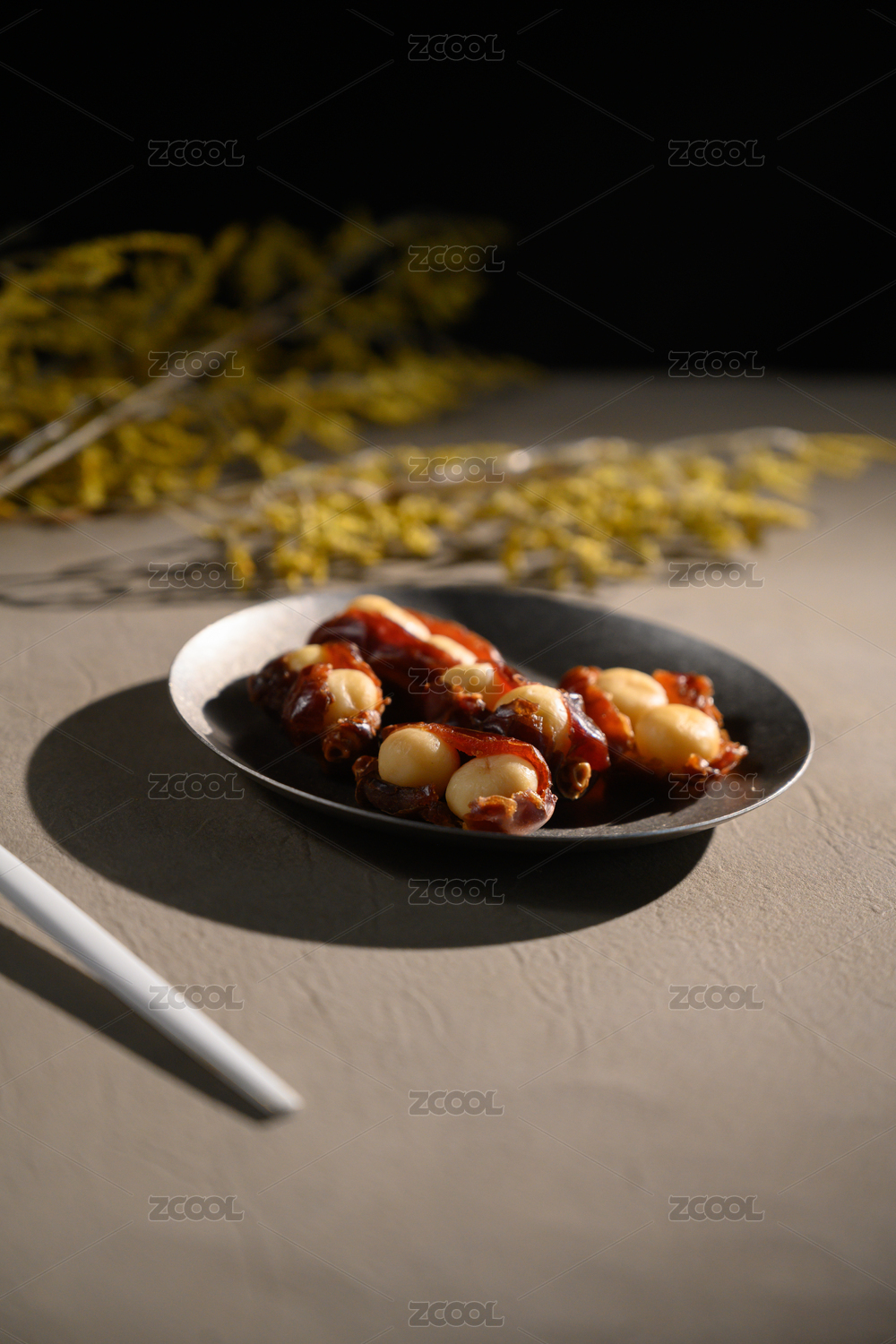 桌面上的盘子里的美味可口的椰枣夏威夷果仁