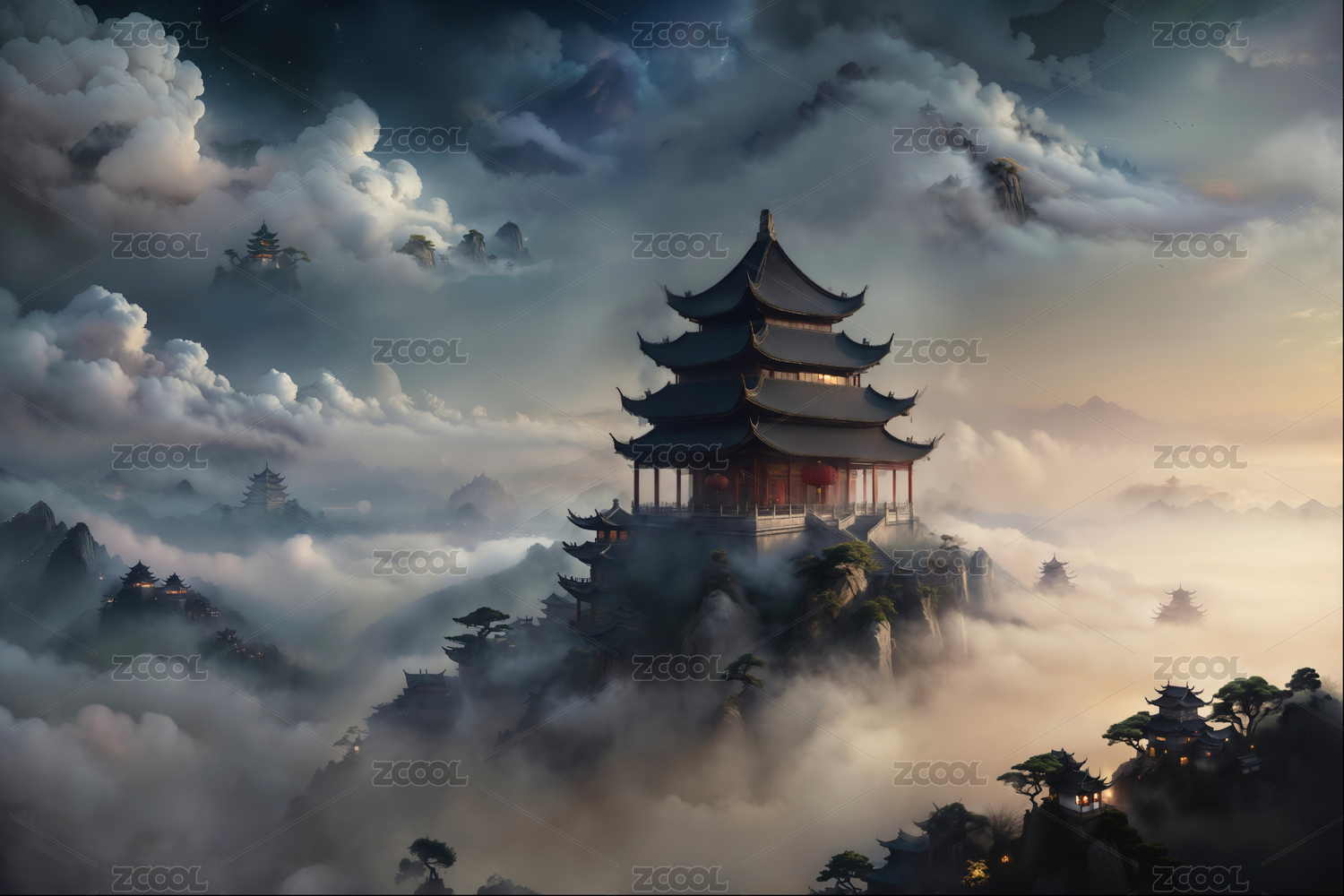 云海,仙阁,山峰,建筑,古典,仙境,梦幻,飘渺,雾气,天空
