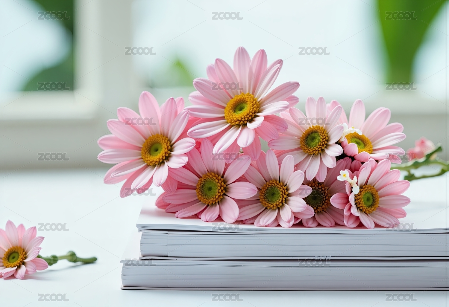 雏菊,粉色,花束,书籍,静物,清新,淡雅,花卉,桌面,白色