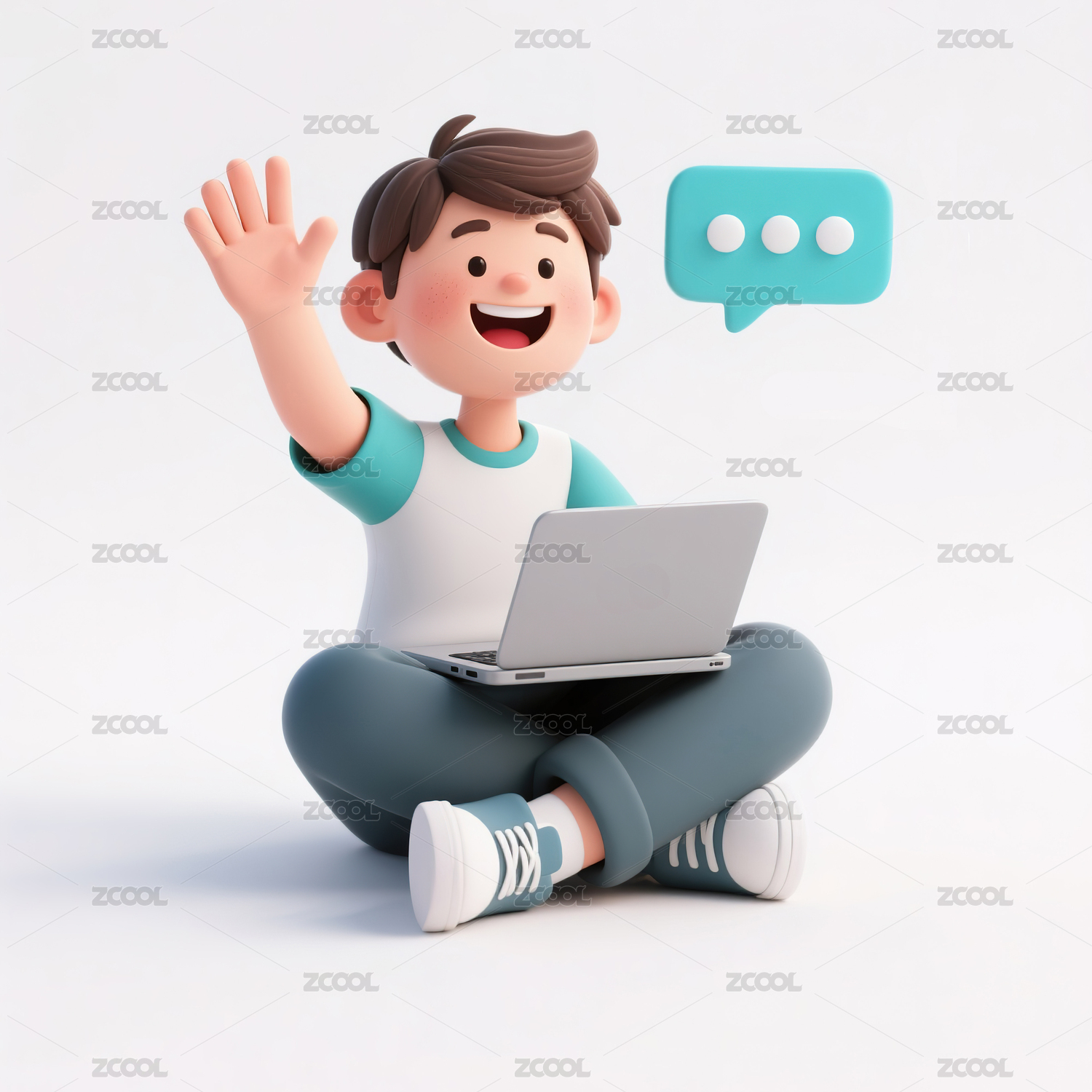 用笔记本电脑在线交流的男孩3d插画