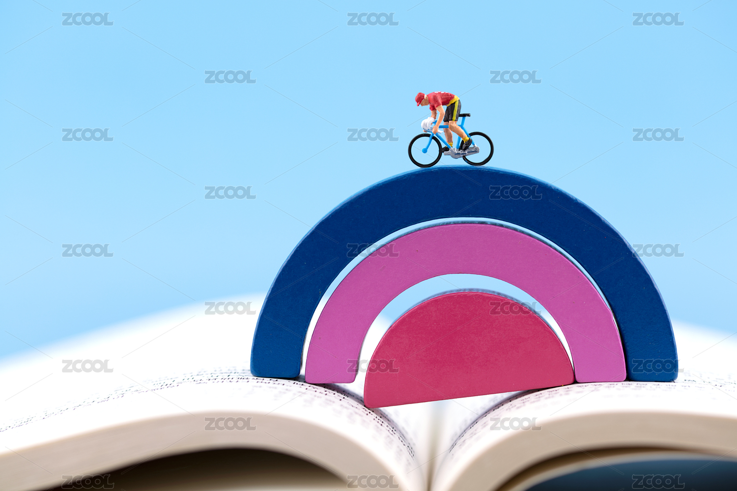 骑车的微缩模型通过彩铅笔到达书本顶端