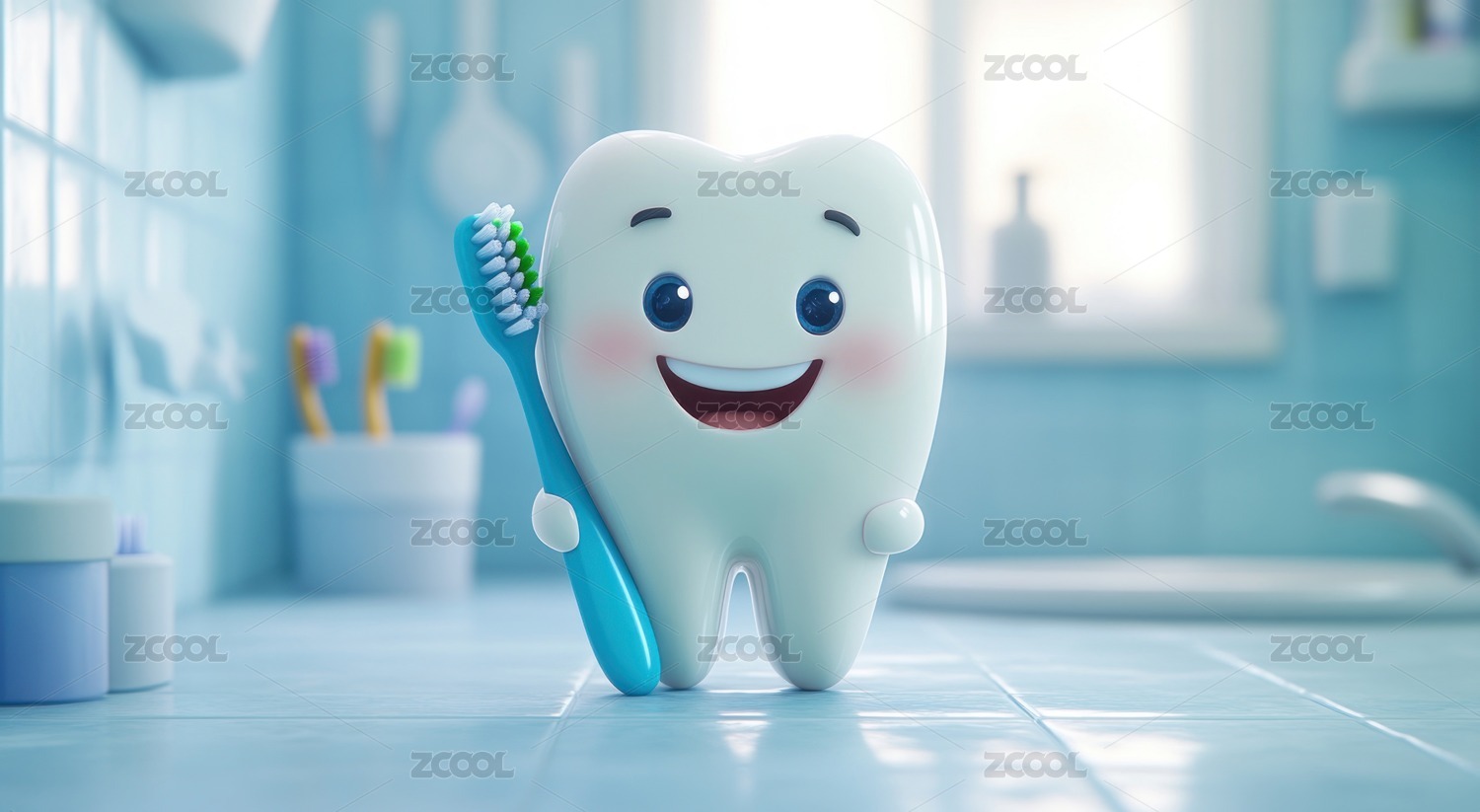 3D可爱的牙齿模型拿着牙刷卡通背景