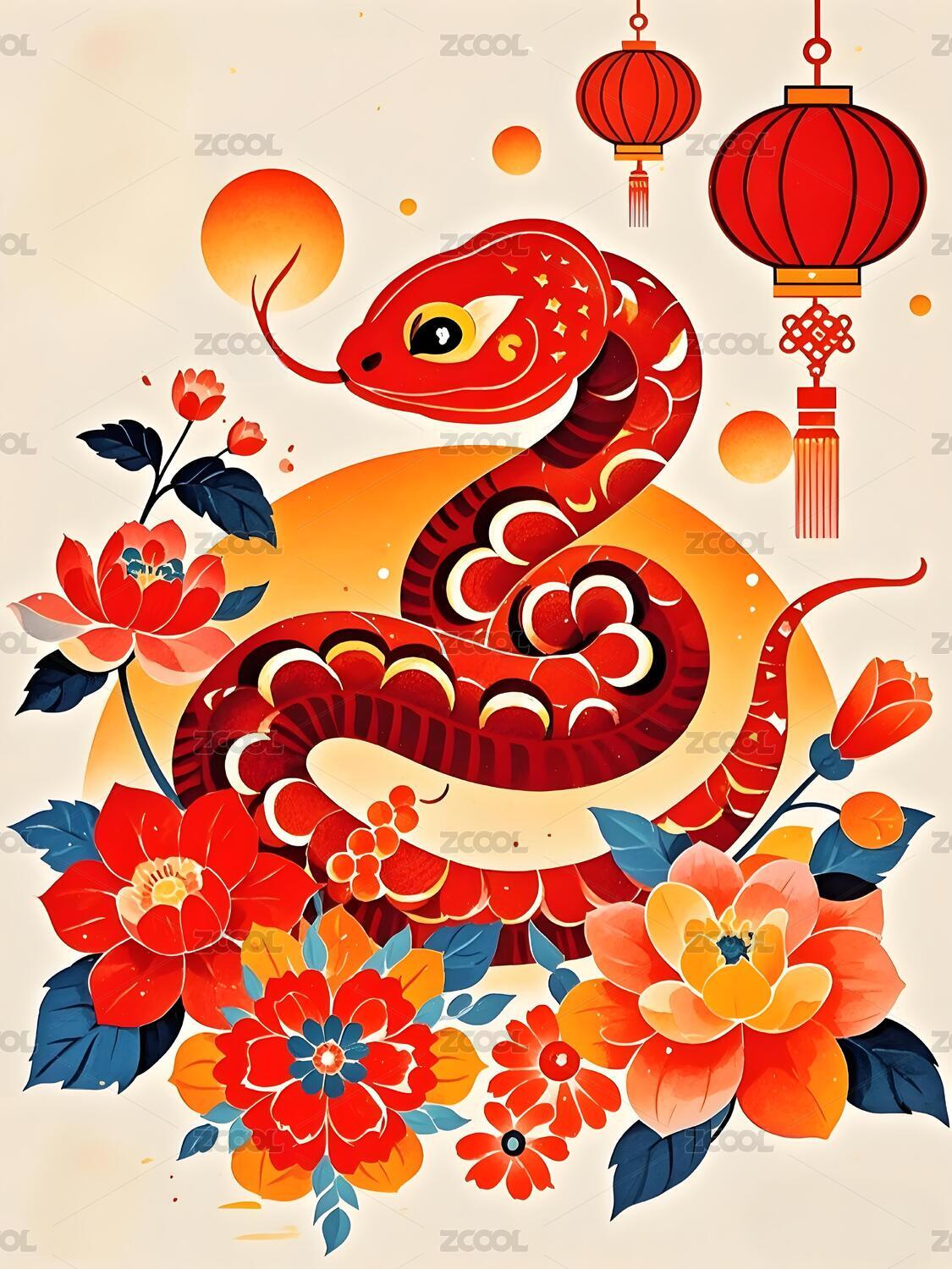 十二生肖蛇年生肖蛇缠绕于牡丹花插画