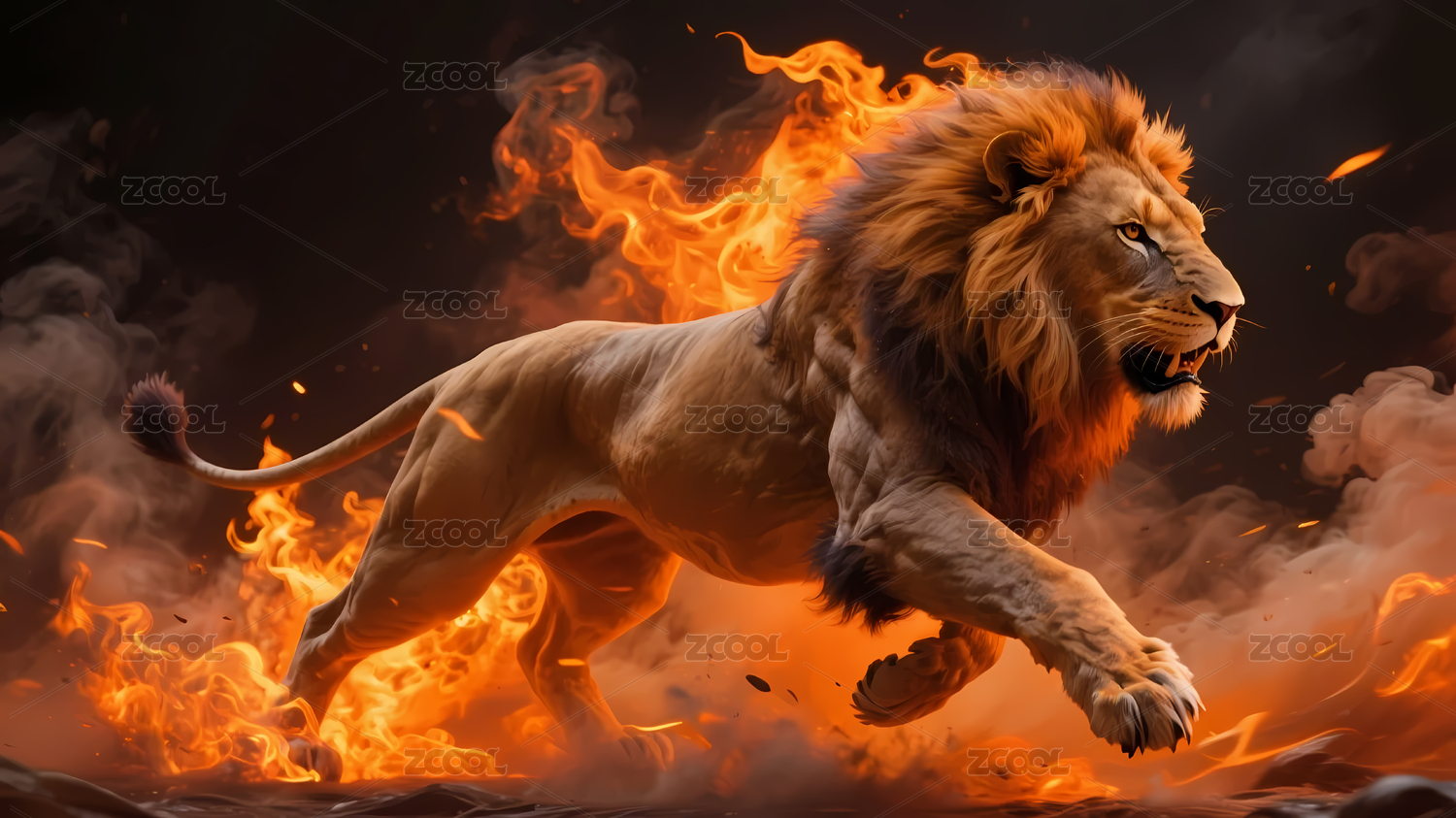 火焰烟雾中奔跑雄狮