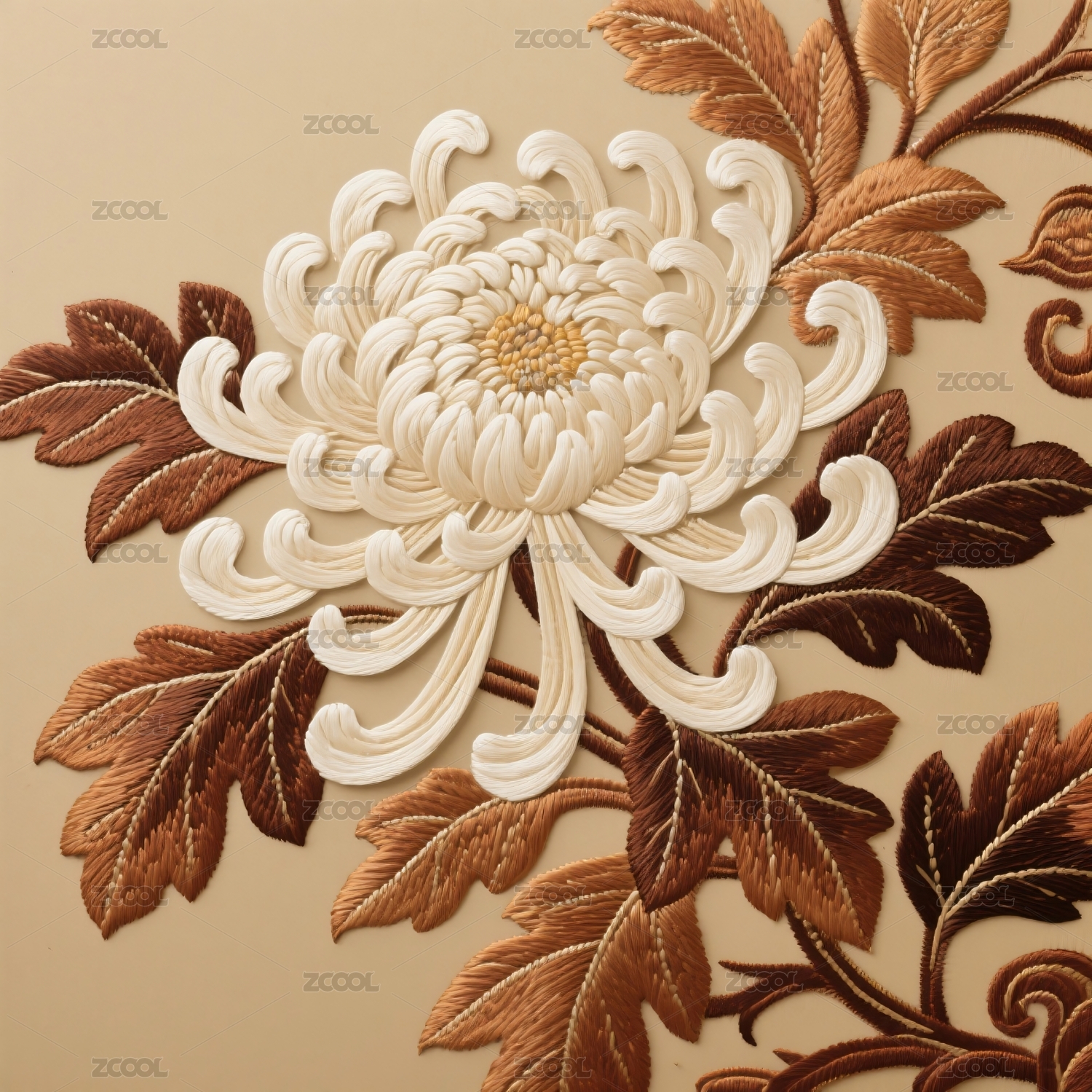 白色菊花绣品与棕色叶子