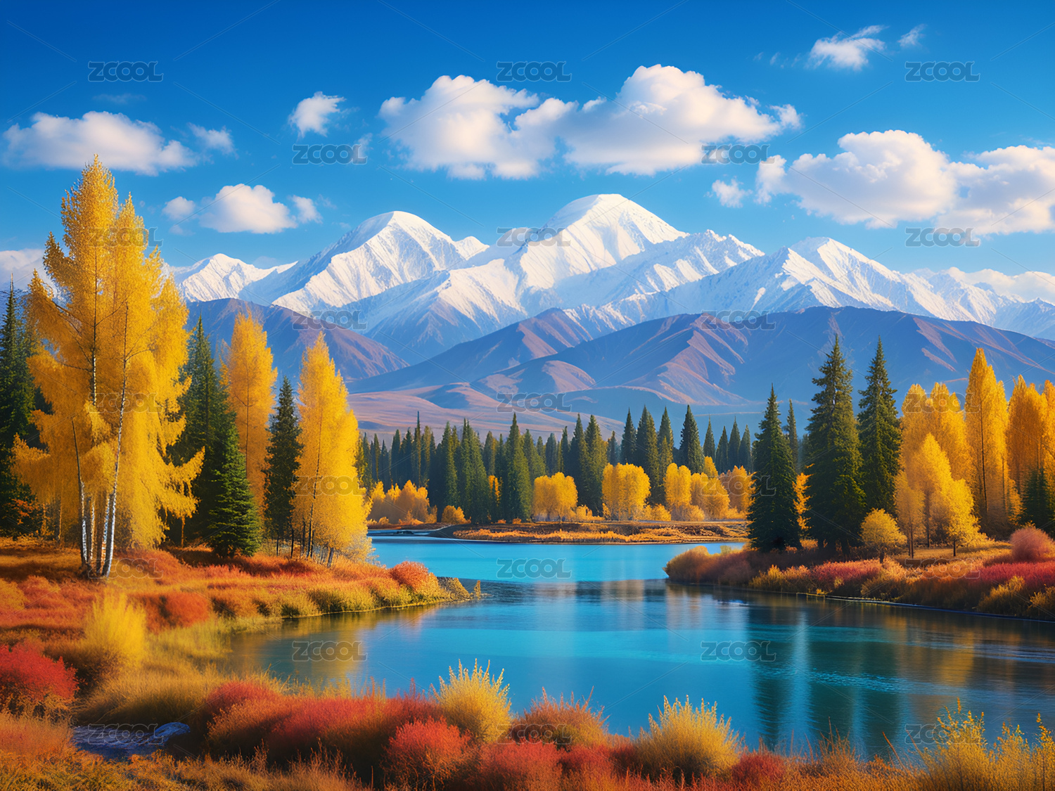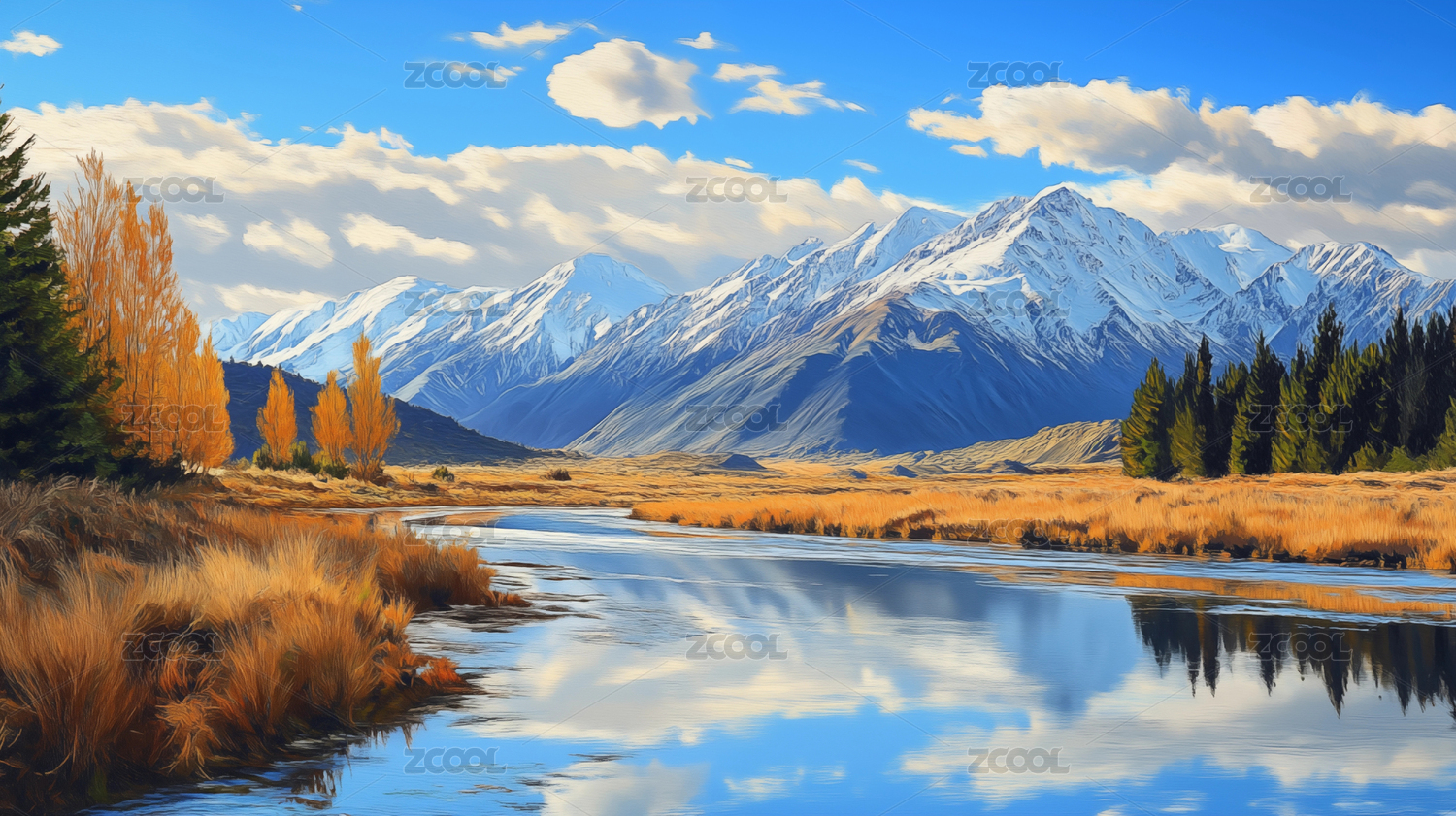 唯美的雪山枯萎的草地冰川溪流风景油画