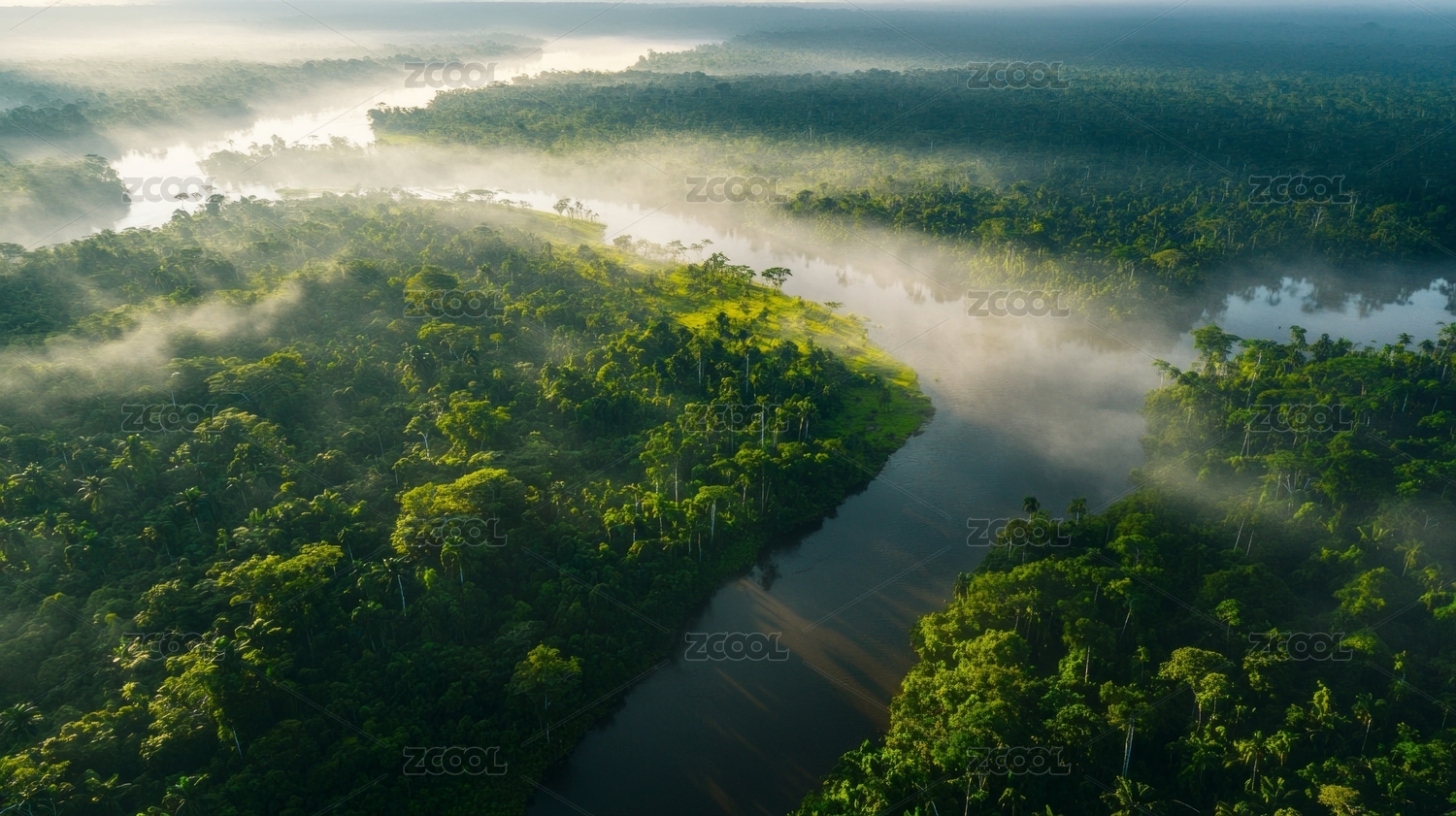 晨雾笼罩的热带雨林河流