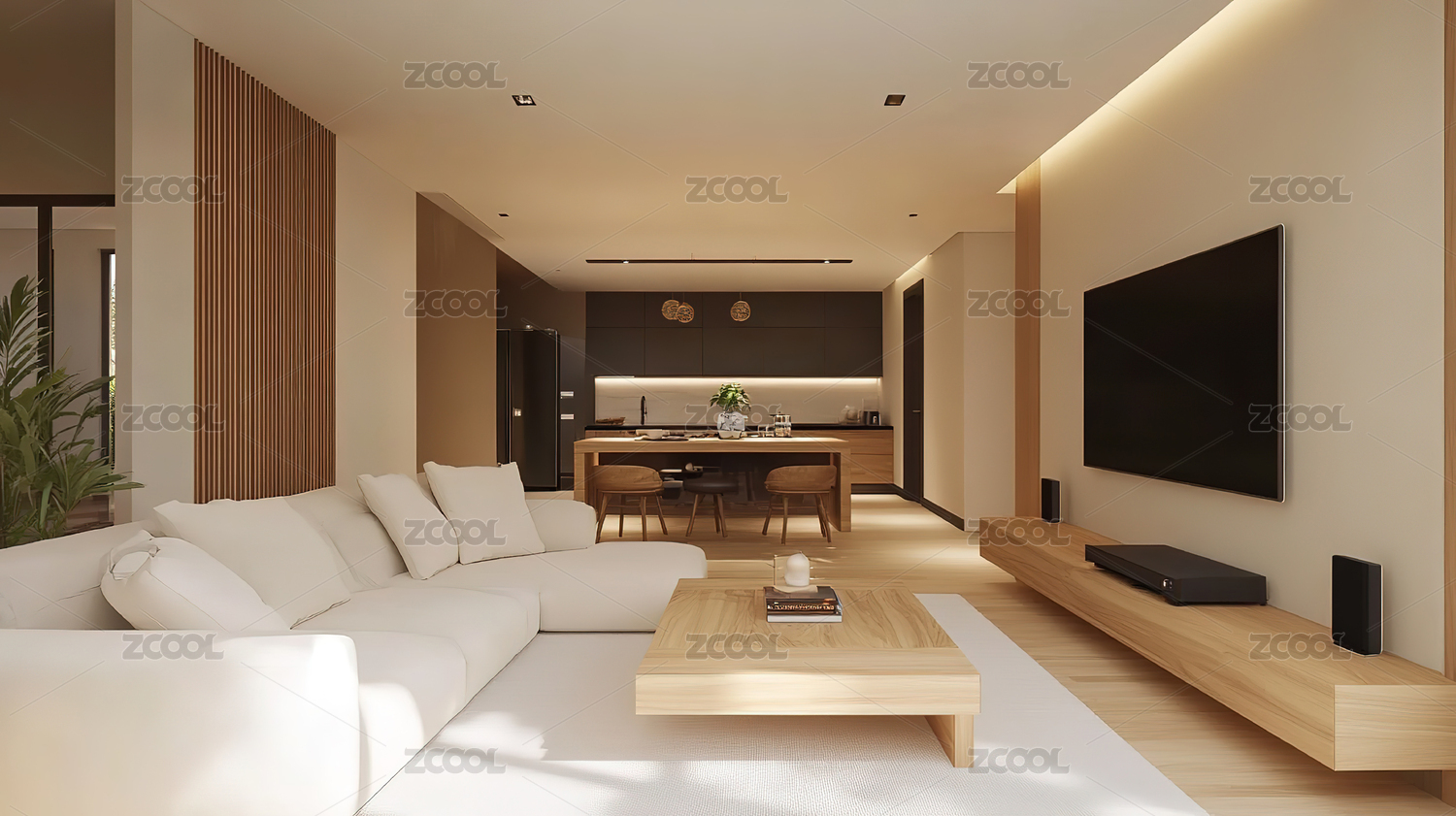 现代简约客厅与开放式厨房设计