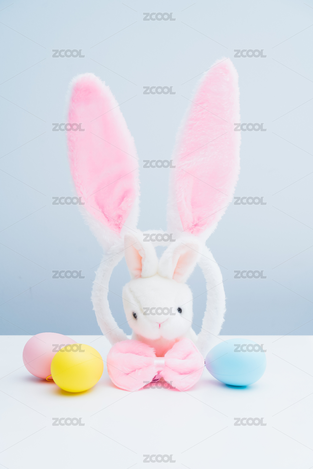 手绘复活节彩蛋和兔耳朵放在白色桌面上