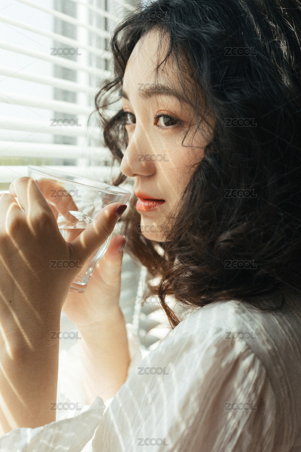站在窗前喝水的女生