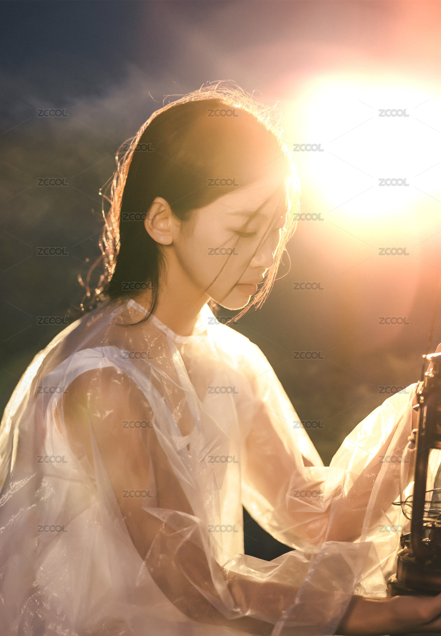 户外公园夕阳下逆光拍摄的亚洲美少女
