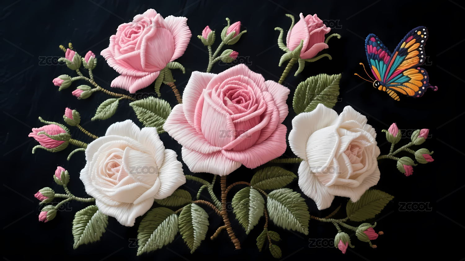 蝴蝶,花朵,粉色,装饰,布料,刺绣,玫瑰,紫色,白色,丝线