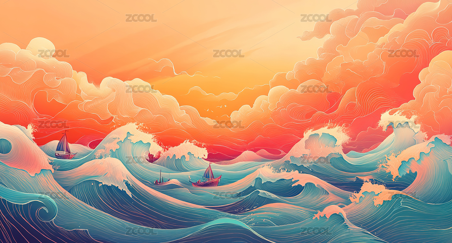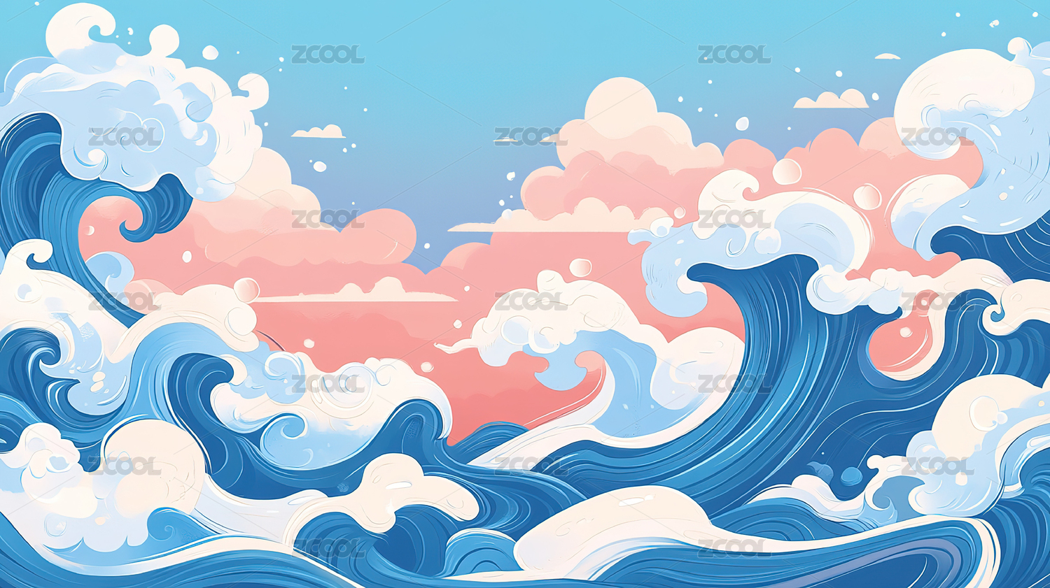 海浪,云朵,水墨风,国风,祥云,波涛,翻涌,天空,水,海洋
