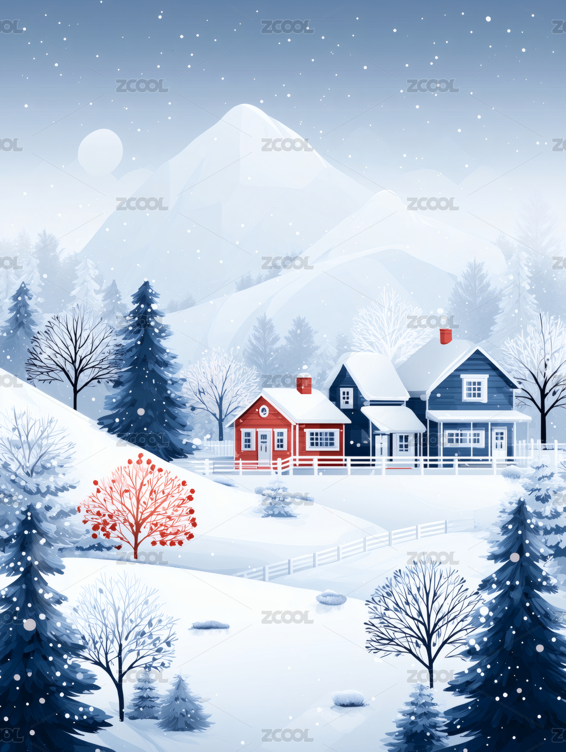 唯美的蓝色冬季雪景艺术插画