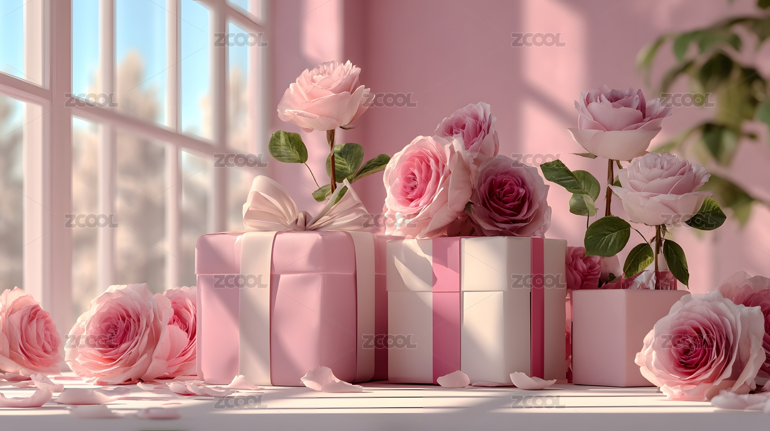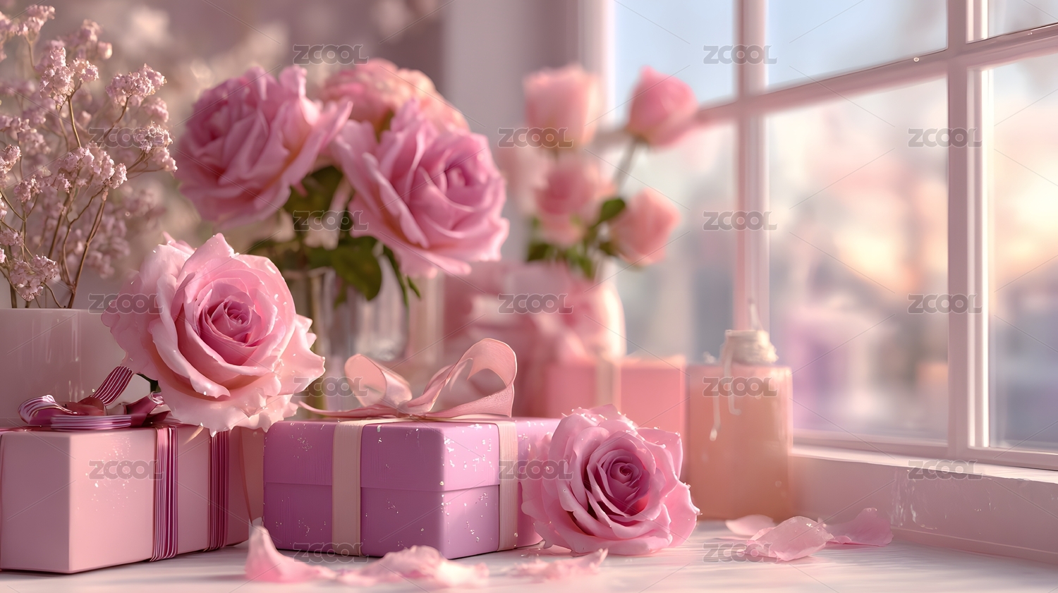 粉色礼物与玫瑰花 浪漫温馨窗边场景