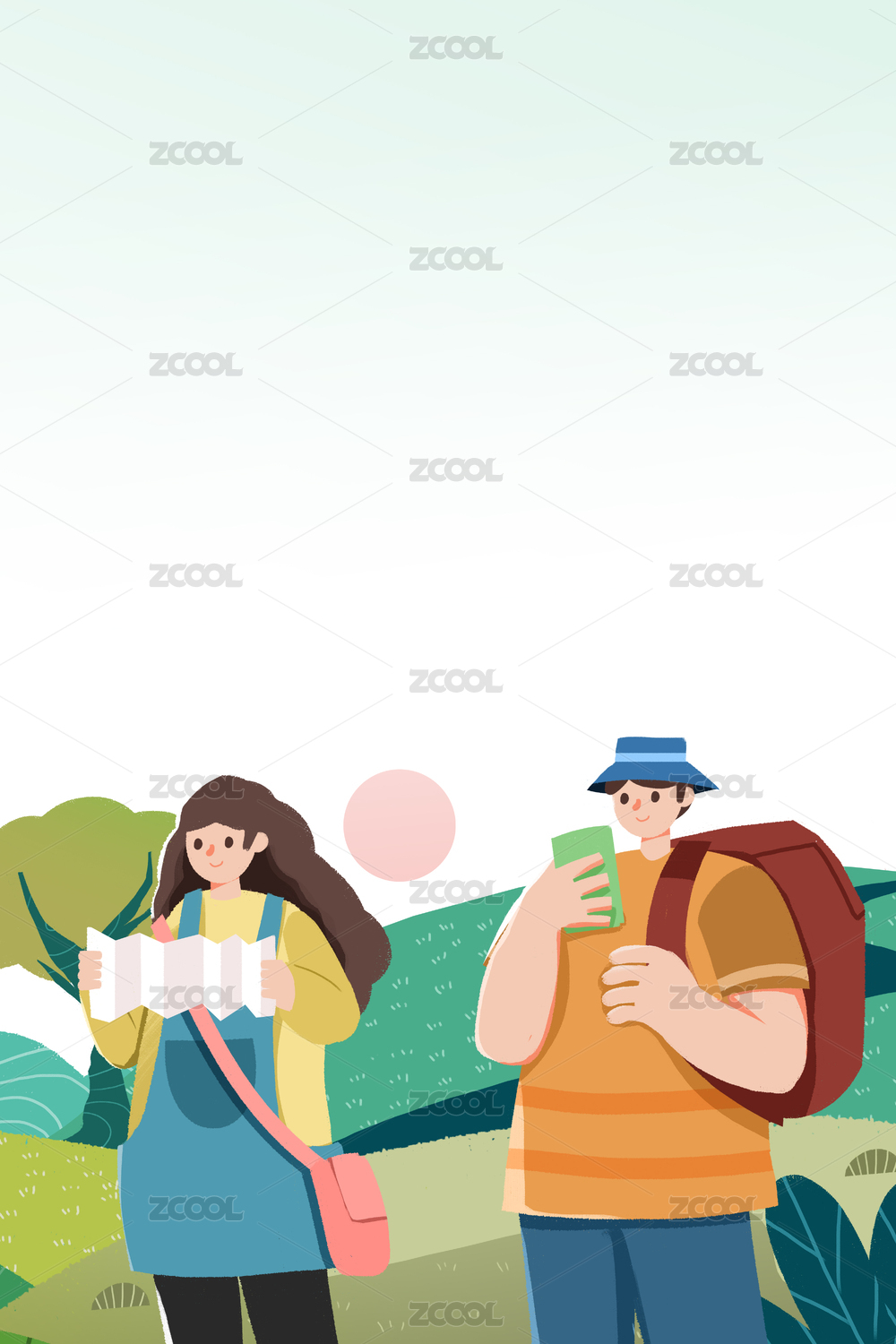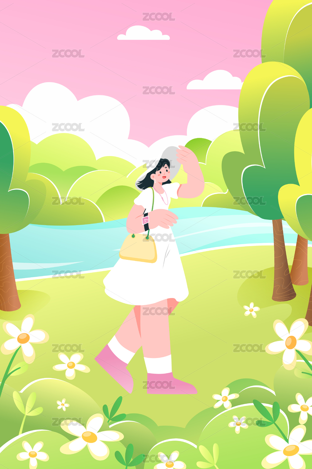 卡通人物夏季踏青旅游登山风景出行矢量插画