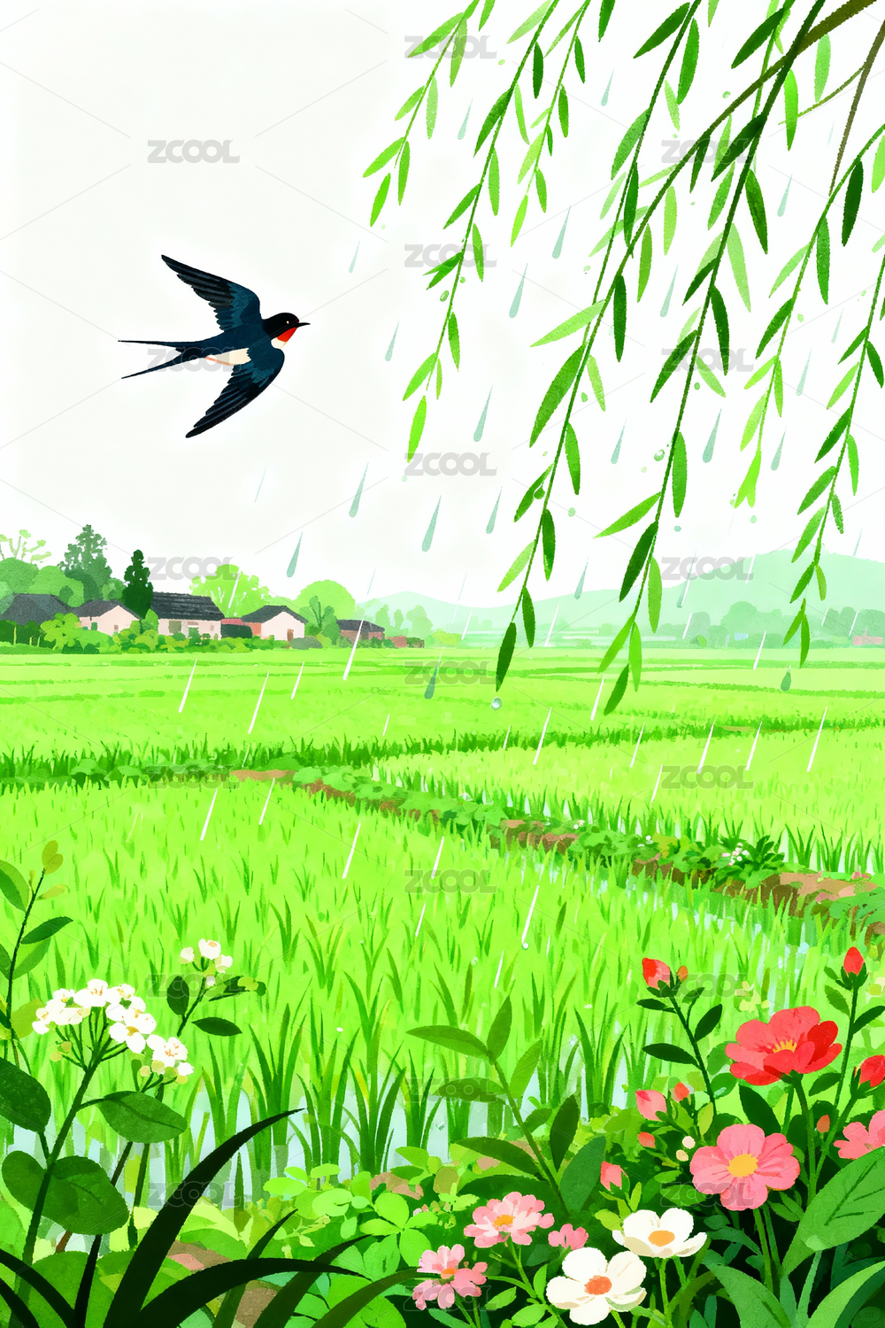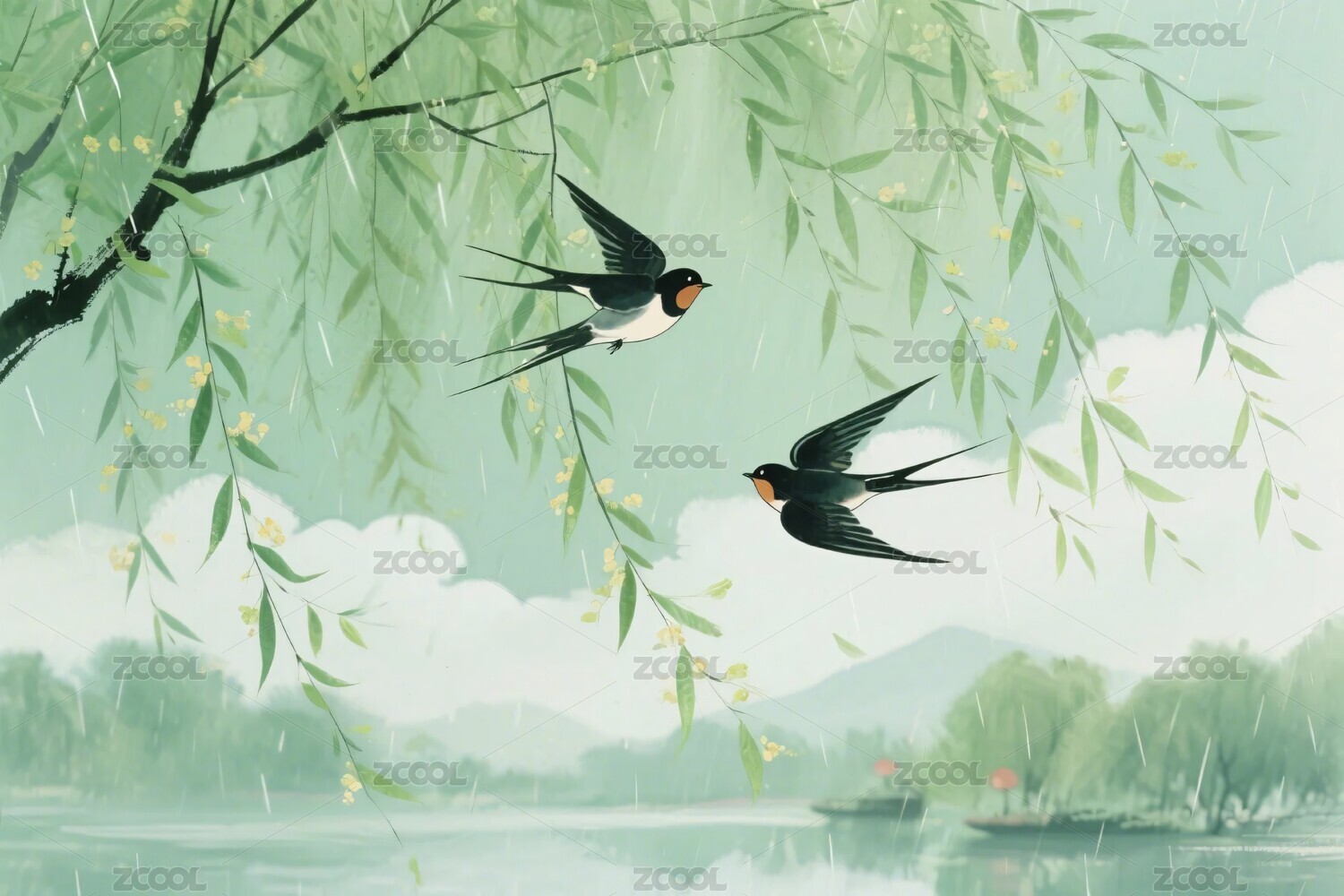 斜风细雨杨柳燕子插画