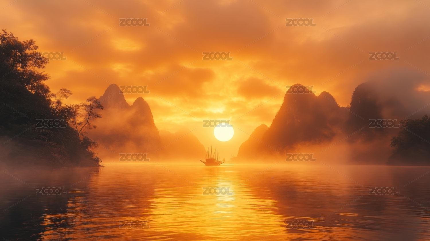 景色,山峦,自然,宁静,美丽,雾气,清晨,山峰,日出,湖泊