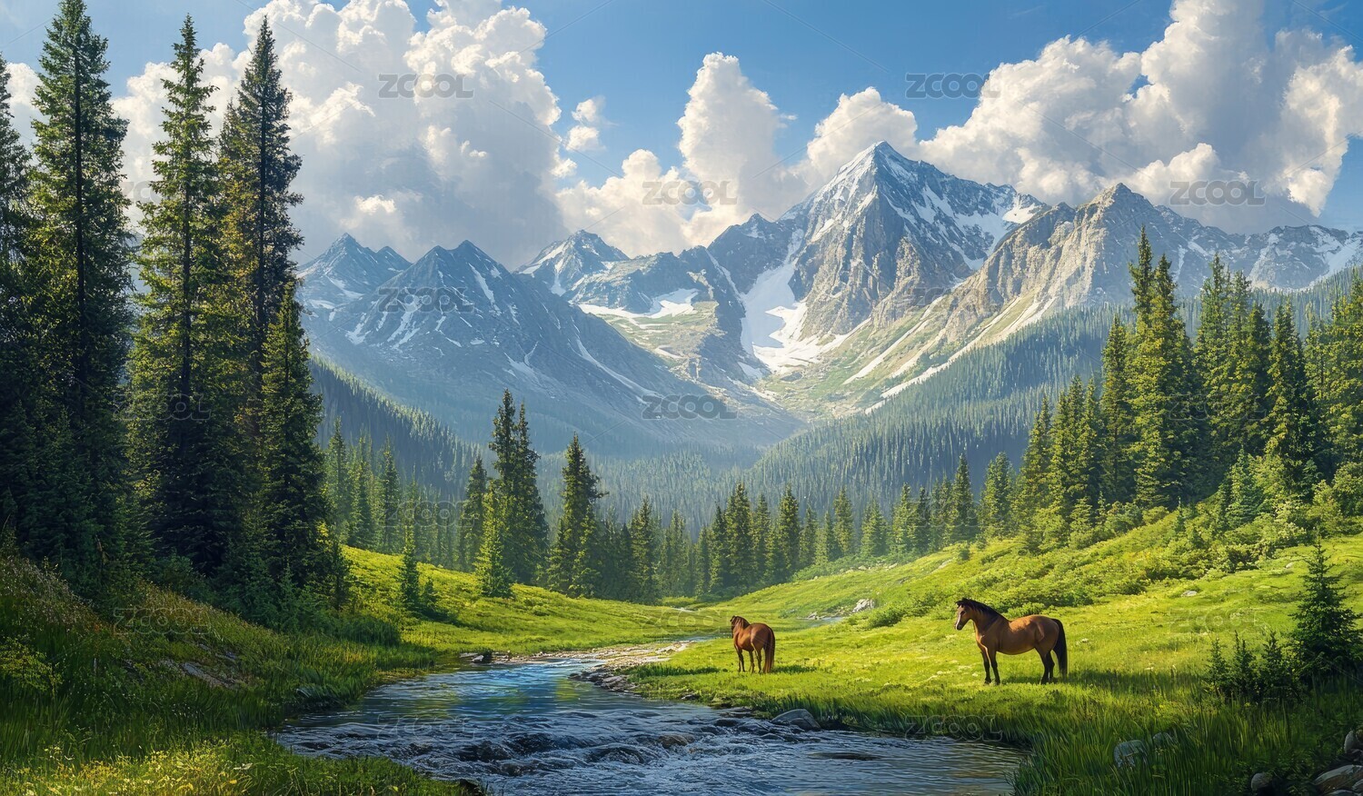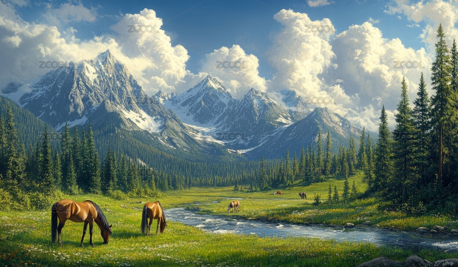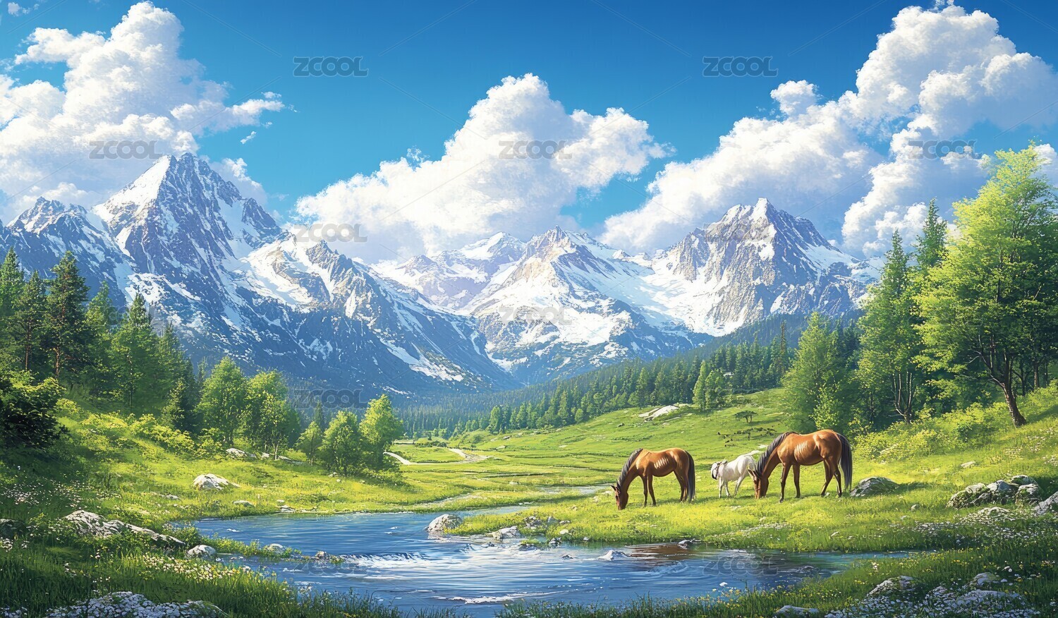 山景,草地,溪流,马匹,吃草,森林,自然风光,高山,天空,自然