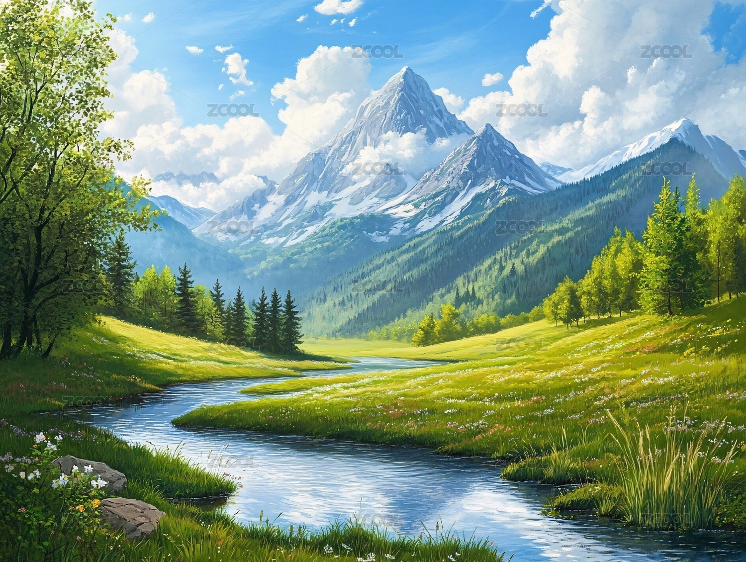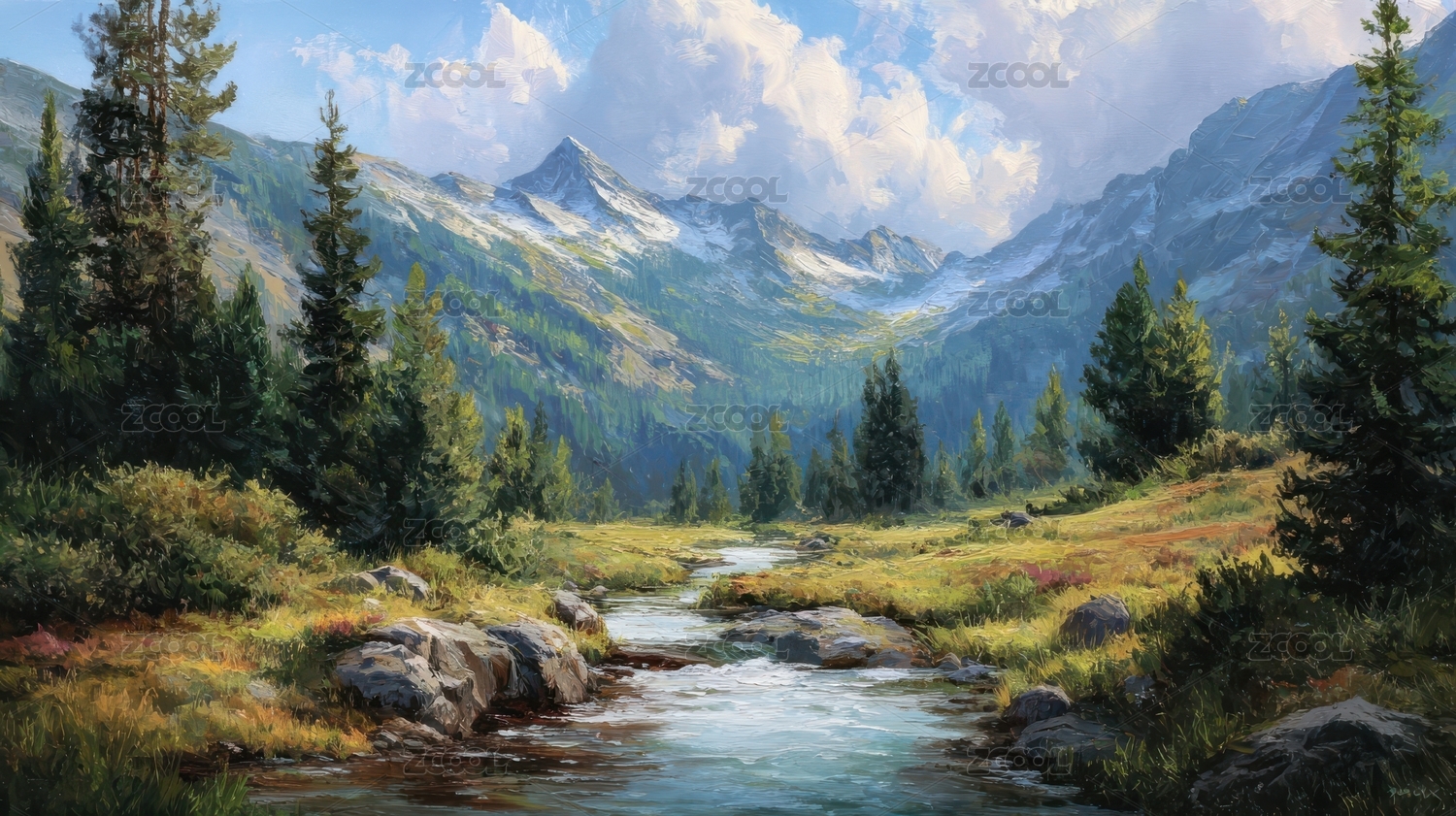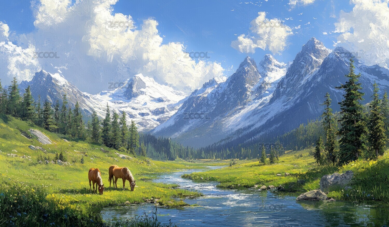 山景,草地,溪流,马匹,吃草,森林,自然风光,高山,天空,自然