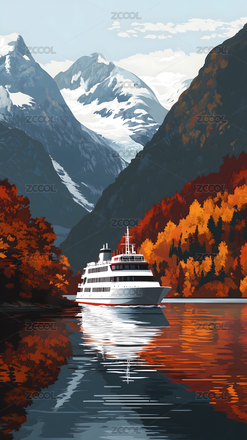 游轮,湖泊,雪山,红叶,秋天,宁静,美丽,风景,旅行,自然