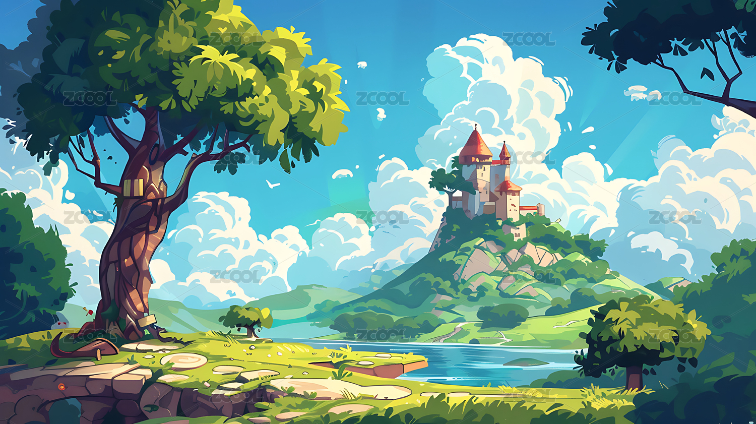 像素,风格,风景,自然,山脉,树木,河流,艺术,插画,背景