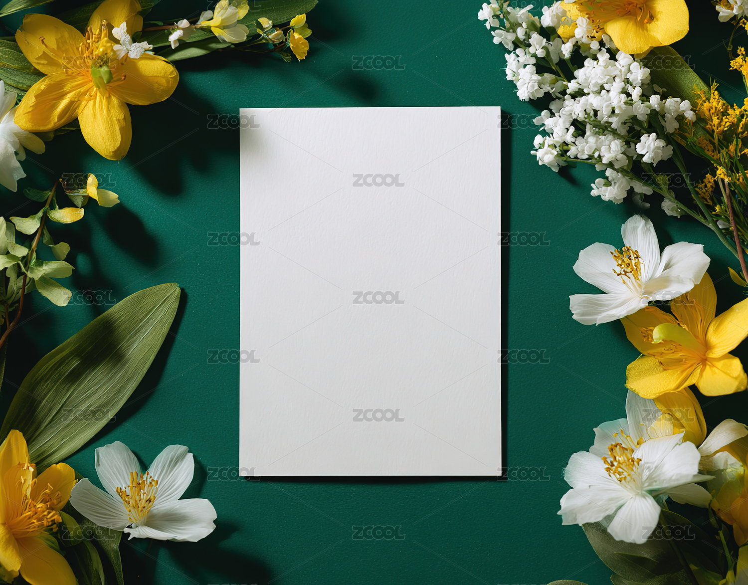 正上方是白色背景上的花朵和树叶