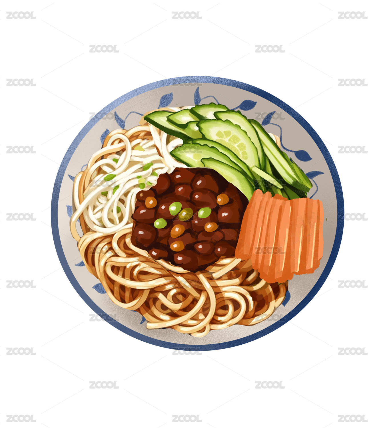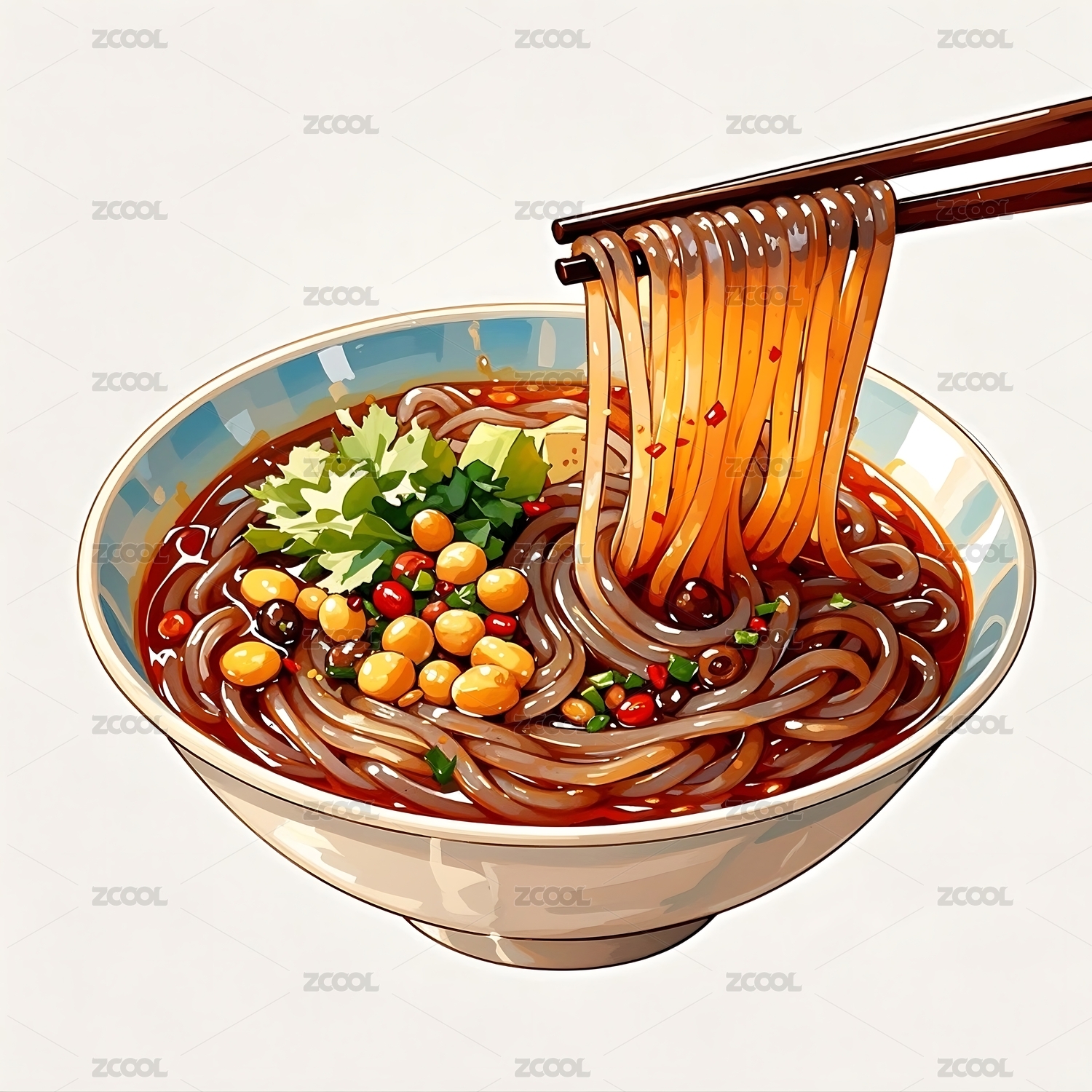 筷子挑起一碗诱人的米粉面条干拌面小吃手绘