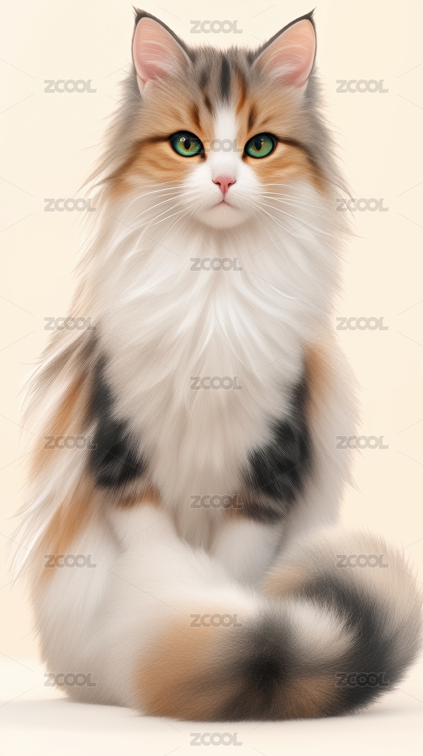 毛茸茸的三色猫坐着