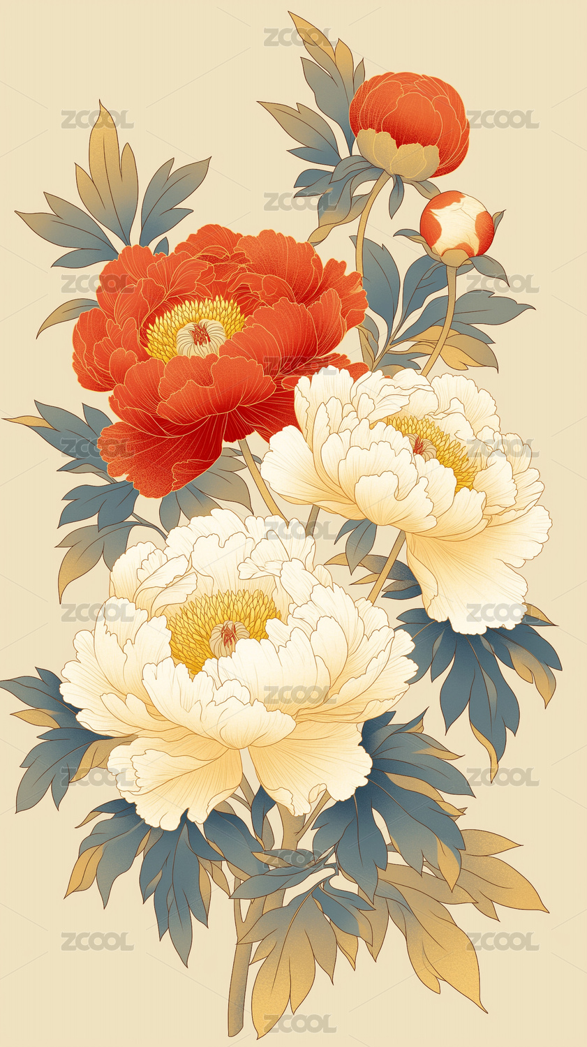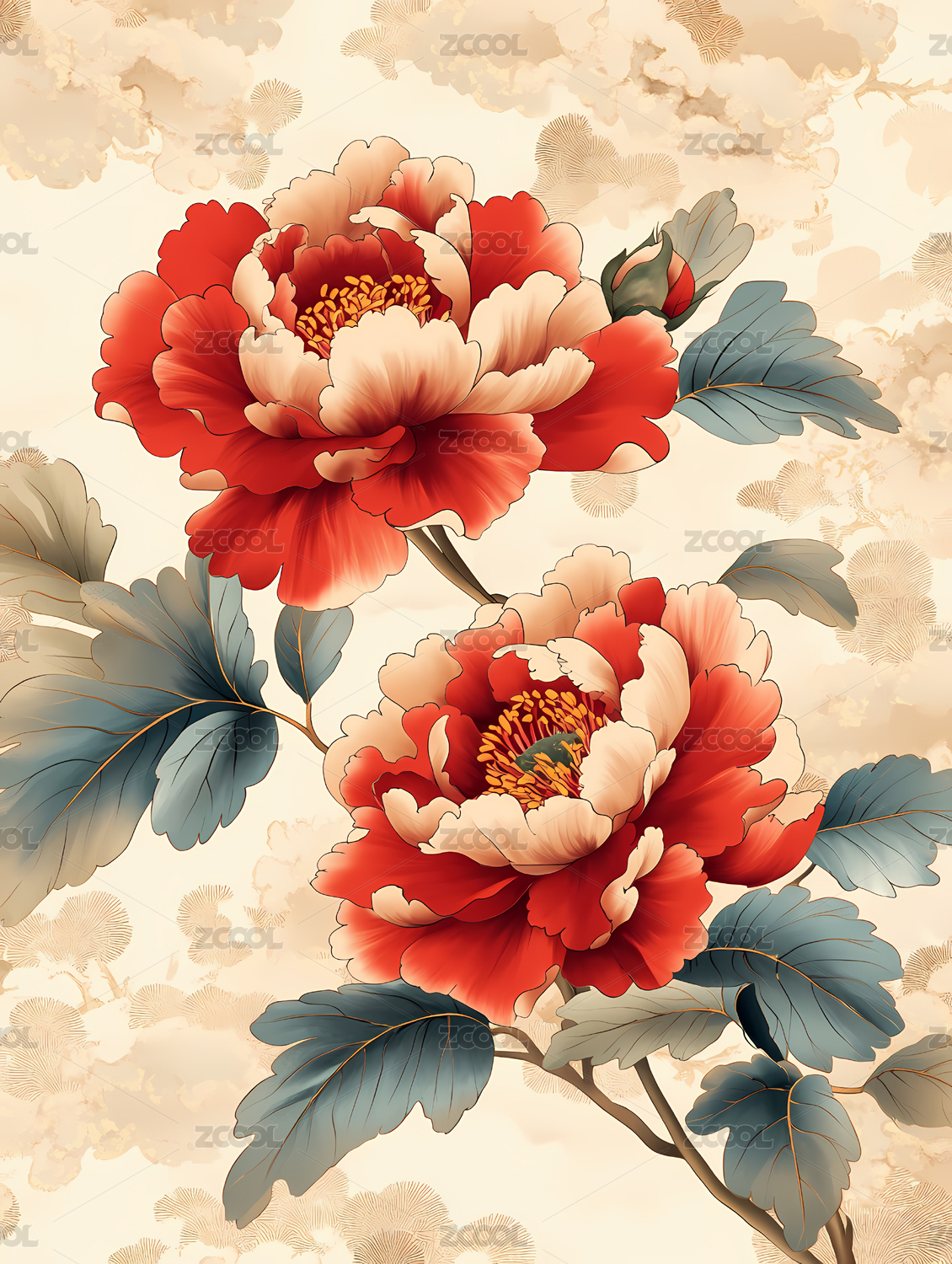 背景,红色,花瓣,菊花,白色,叶子,枝干,绘画,质感,水墨