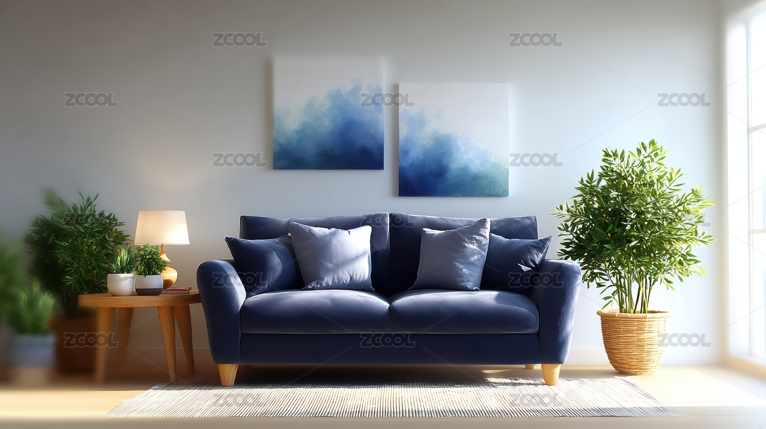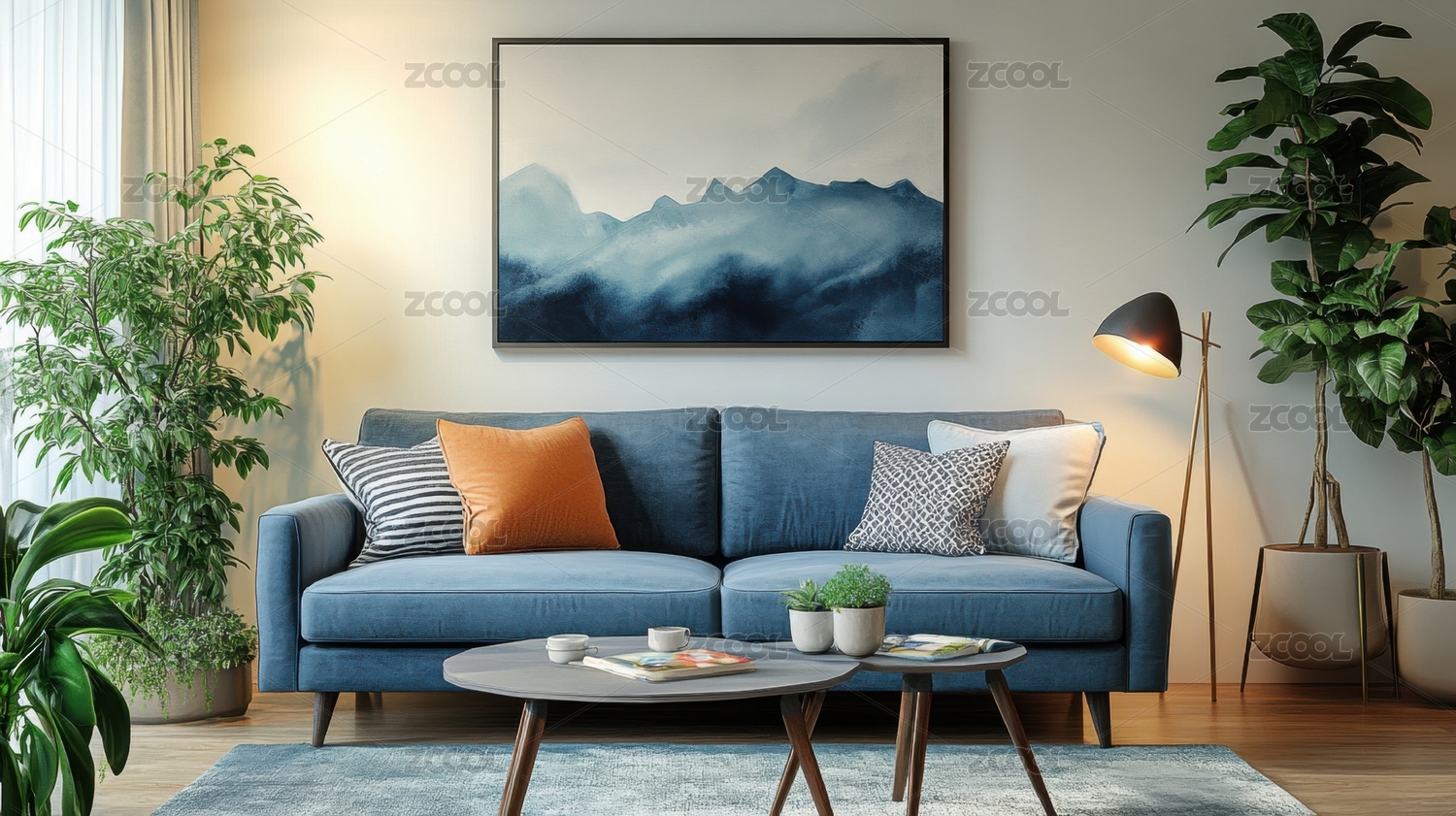 沙发,蓝色,客厅,家居,装饰,植物,画,灯,抱枕,室内