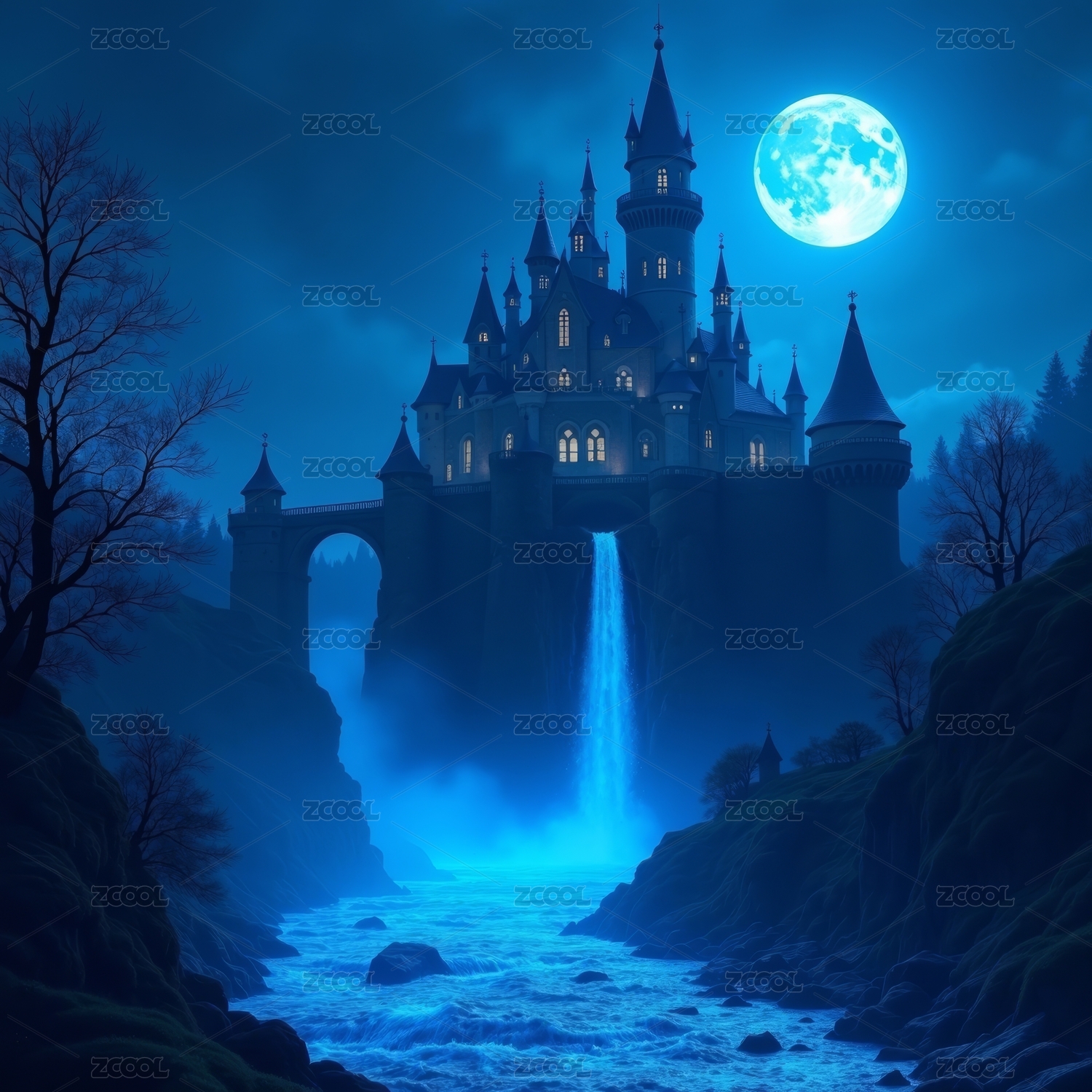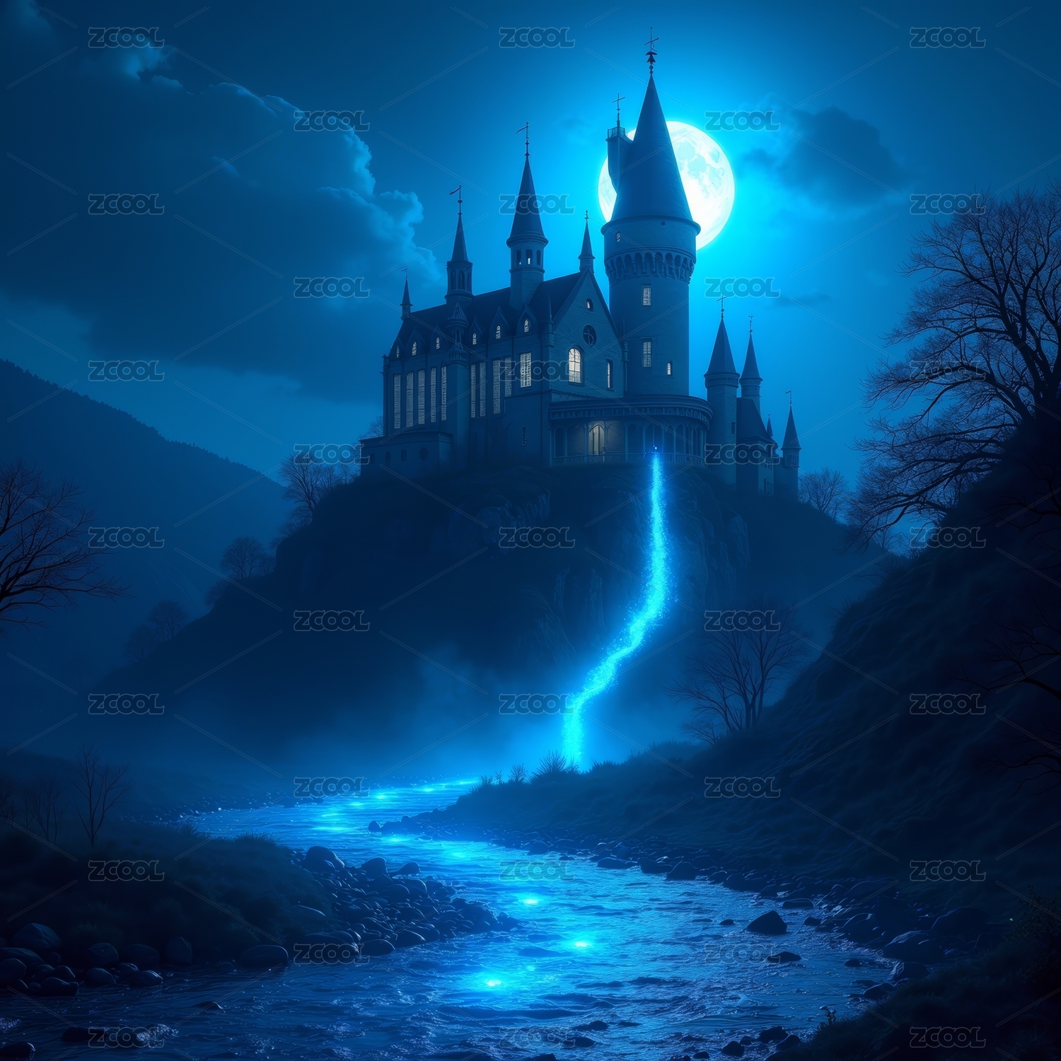 古堡,城堡,月夜,月亮,迷雾,雾气,蝙蝠,森林,树木,山峰