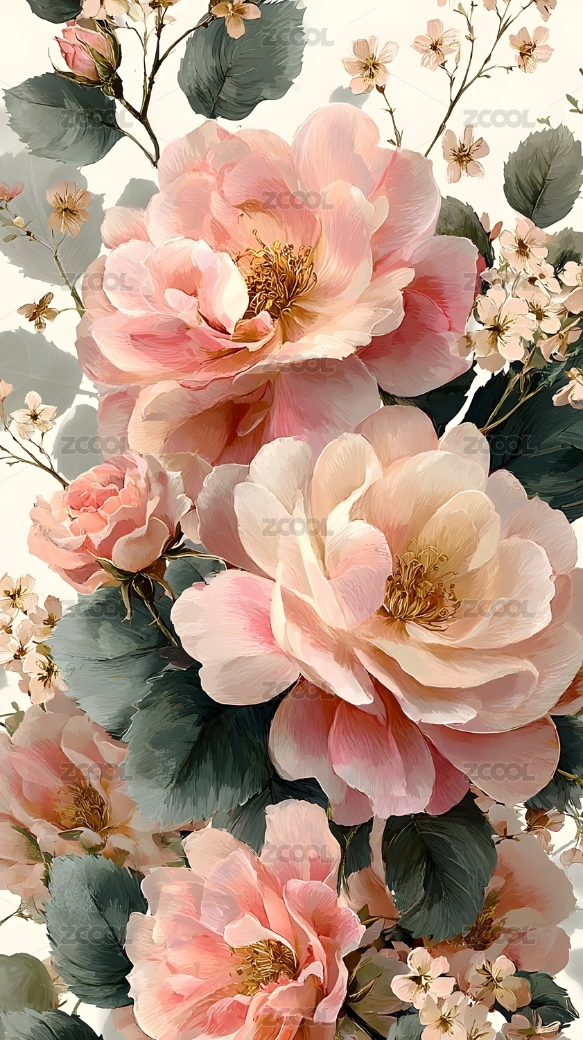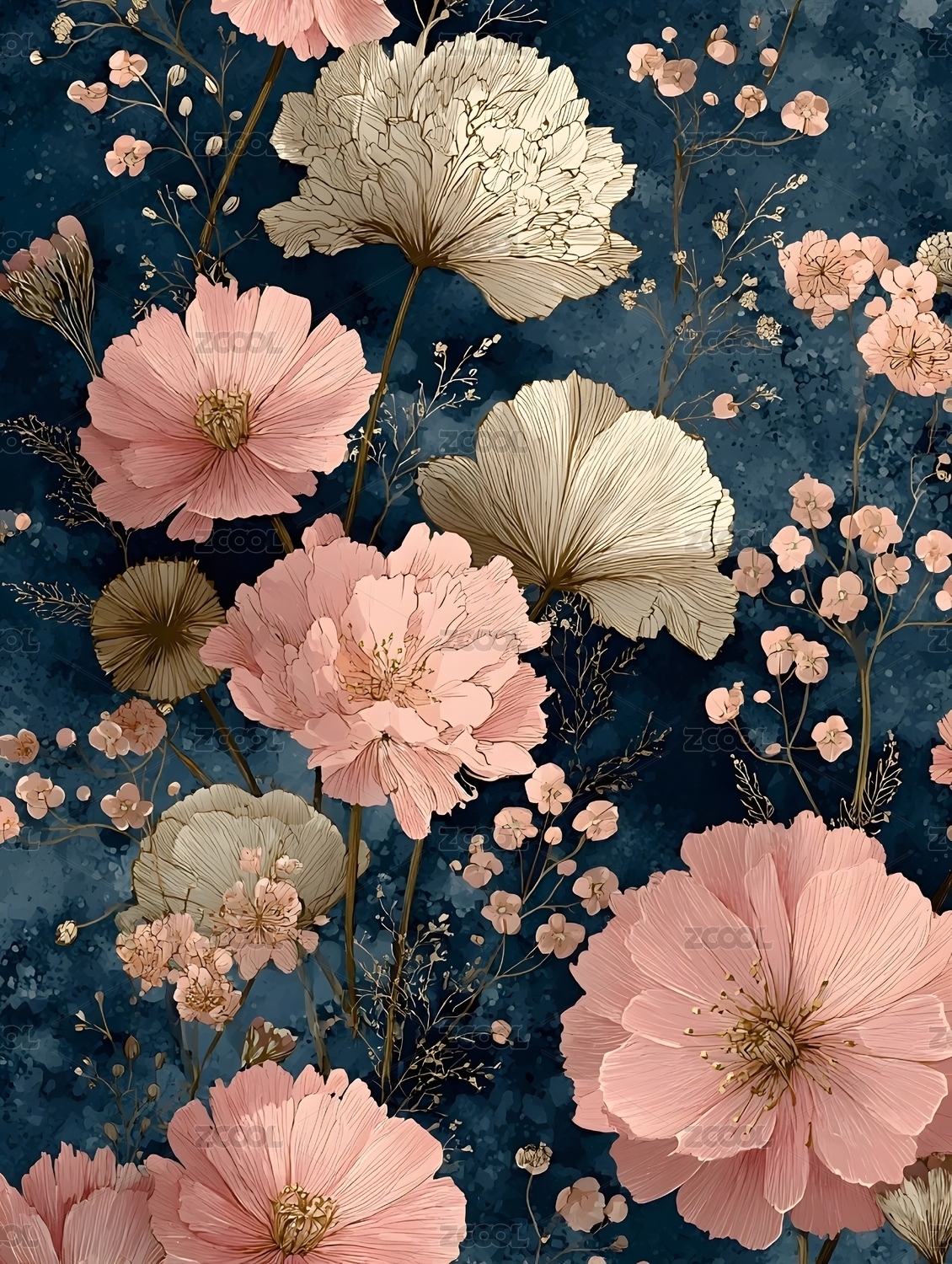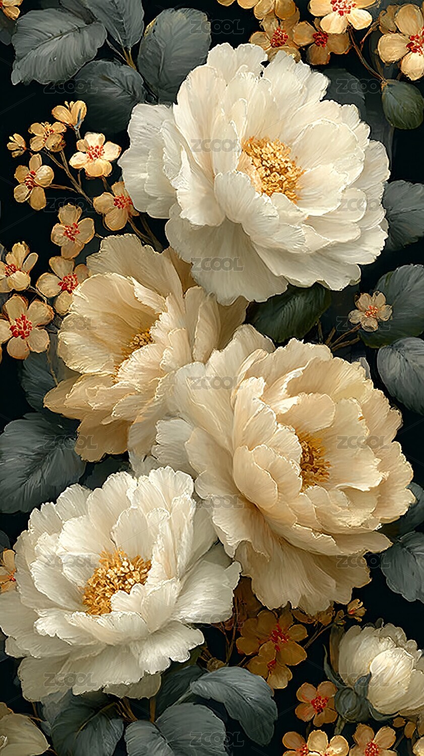 花卉,白花,蓝花,橙花,叶片,图案,纹理,复古,精致,装饰