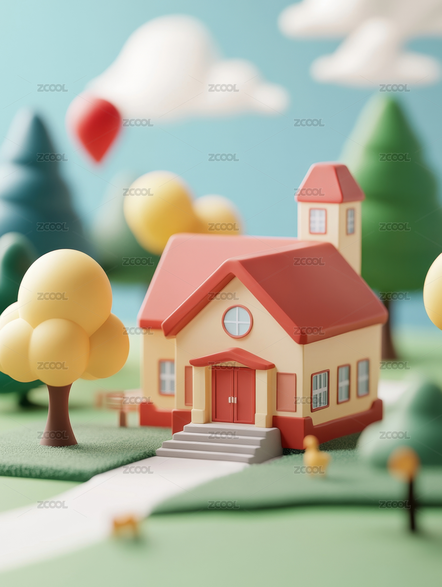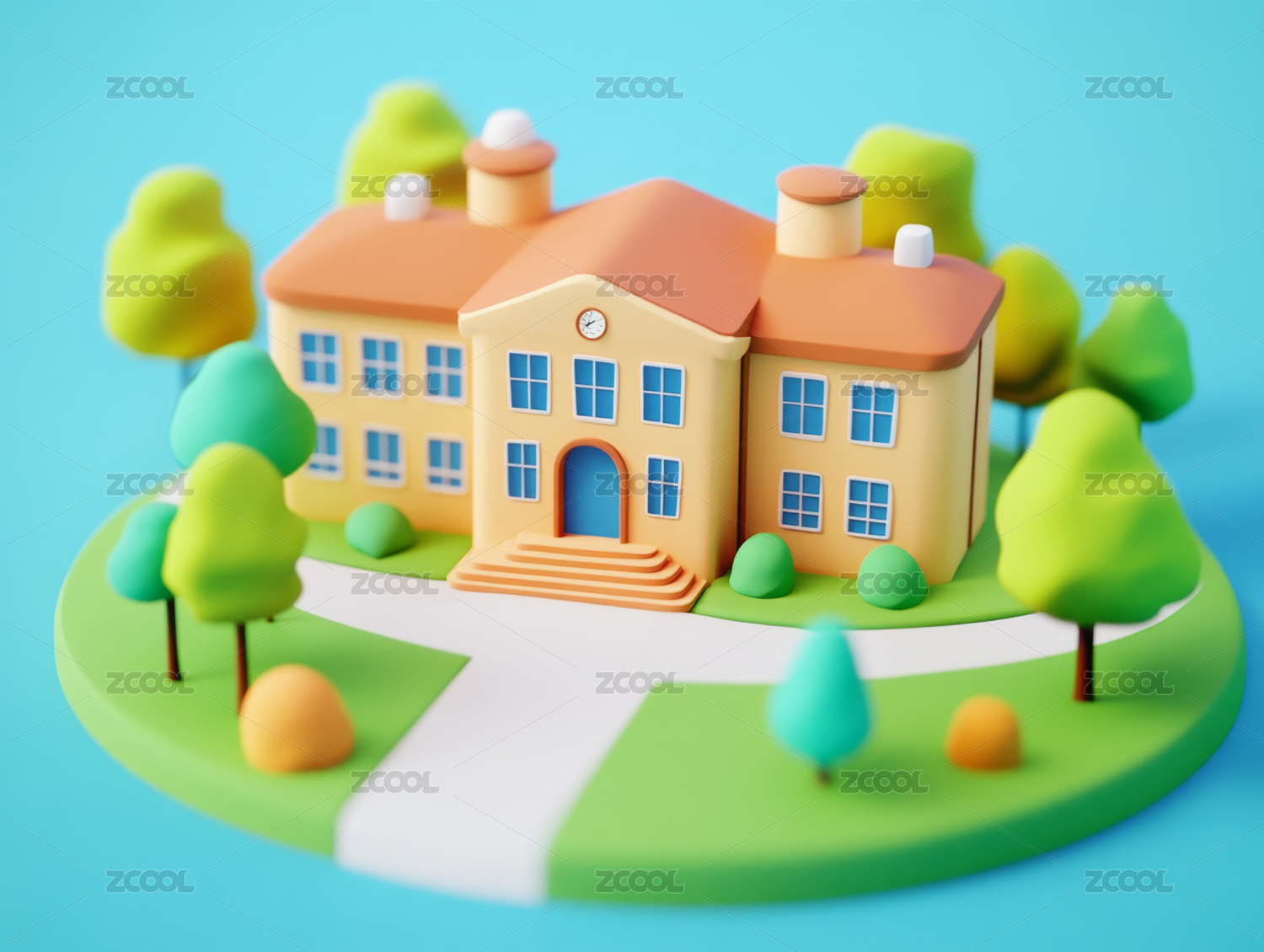 学校,建筑,卡通,树木,路径,钟表,窗户,门,石头,草地